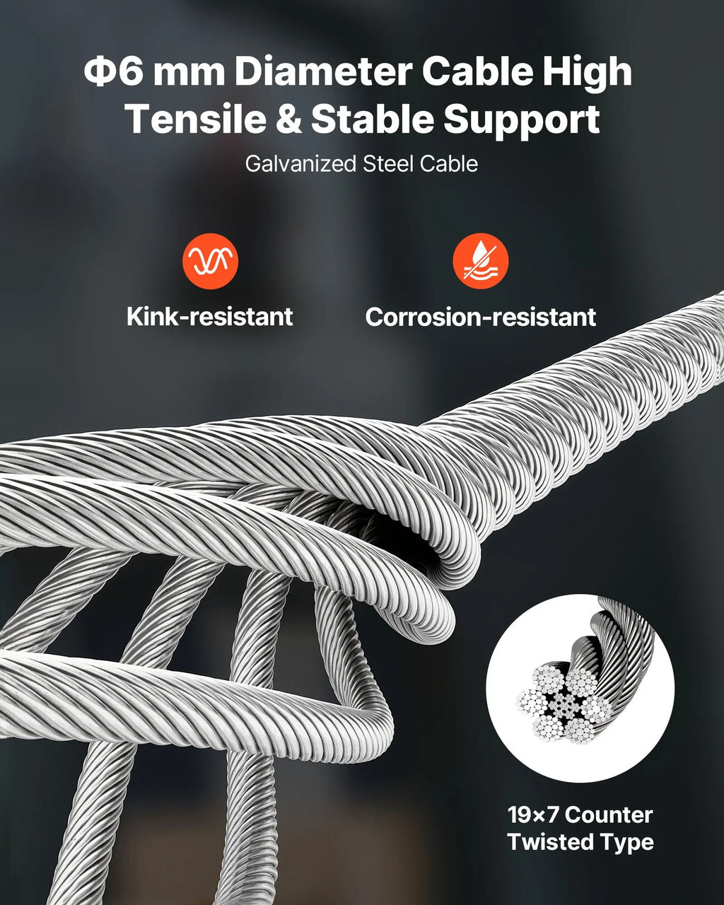 Izturīga troses konstrukcija: Komplektā iekļauta augstas stiprības cinkota tērauda troses virve, kas iztur griešanos un koroziju. Troses dizains novērš savērpšanos un nodrošina drošu ilgtermiņa lietošanu.