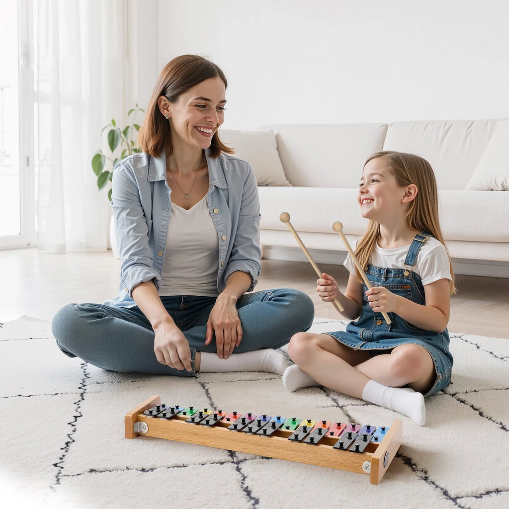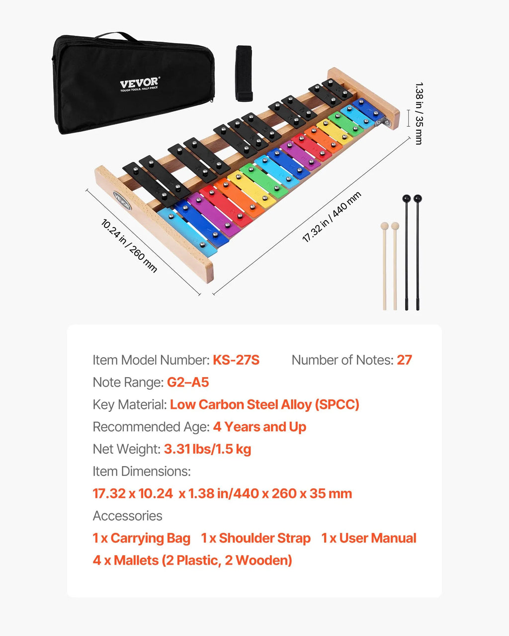 VEVOR 27 toņu glokenspīls/ksilofons ar krāsainiem metāla taustiņiem, profesionāls perkusiju instruments ar 4 vālītēm un pārnēsājamo somu, piemērots iesācējiem un pieaugušajiem