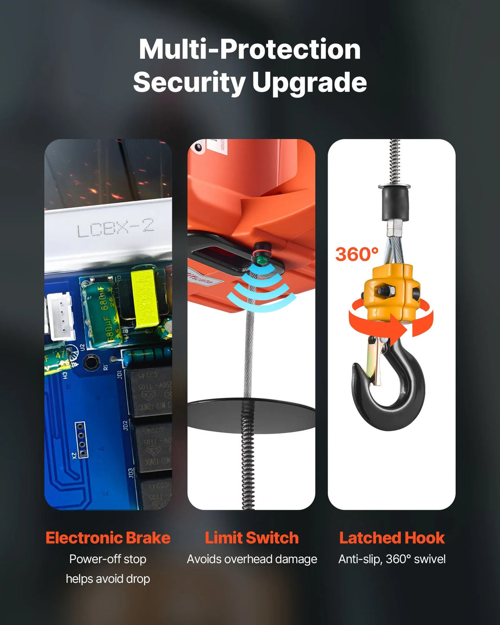 Daudzslāņu drošības aizsardzība: Elektriskais pacēlājs apvieno elektronisko un mehānisko bremzi drošai apstādināšanai. Gala slēdzis un 360° fiksējams āķis palielina drošību, bet motors automātiski apstājas strāvas zuduma vai augšējās robežas sasniegšanas gadījumā, novēršot kravas krišanu.