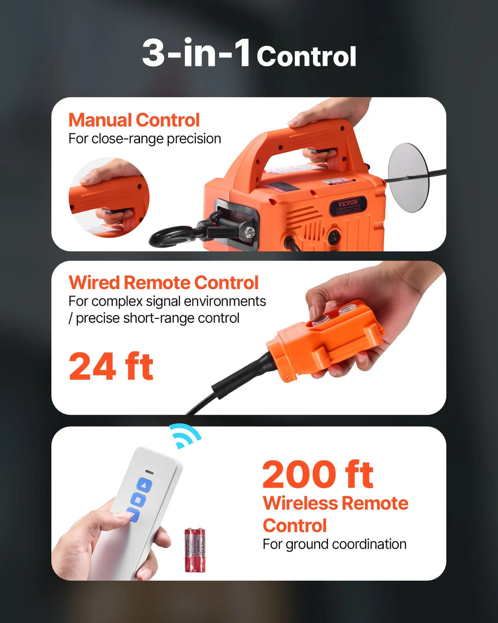 3-vienā ērta vadība: Elektriskais pacēlājs nodrošina gan vertikālu celšanu, gan horizontālu vilkšanu vienā ierīcē. Roktura pogas reaģē ātri, 7,3 m vadu pults nodrošina precīzu vadību tuvumā, bet 61 m bezvadu pults ļauj strādāt mobilās komandās.