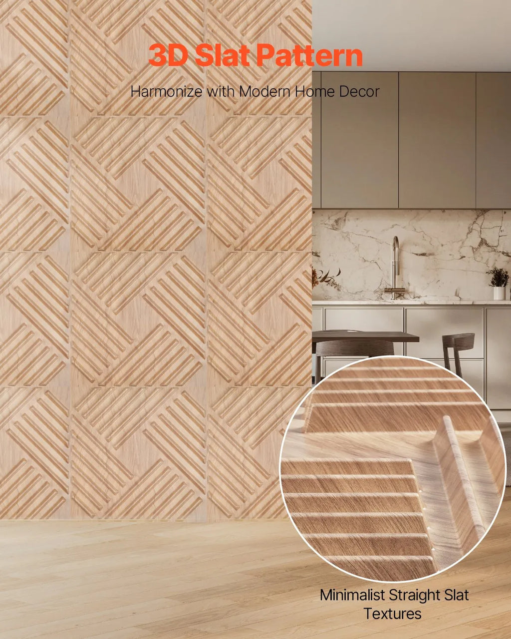 VEVOR 3D sienas paneļi, 12 gab., PVC minimālisma dizaina flīzes, 500 × 500 mm, kopējais pārklājums 3,0 m², akcenta sienas dekors interjeram griestiem, guļamistabai, viesistabai un spēļu telpai, gaiša koka tonī