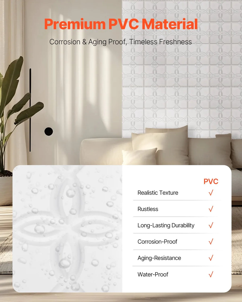 Teksturētie sienas paneļi ir izgatavoti no augstas kvalitātes PVC, kas nodrošina noturību pret novecošanos un saglabā ūdensizturīgas īpašības. Reālistiski un izturīgi paneļi ir piemēroti ilgstošai lietošanai jebkurā mājas telpā.
