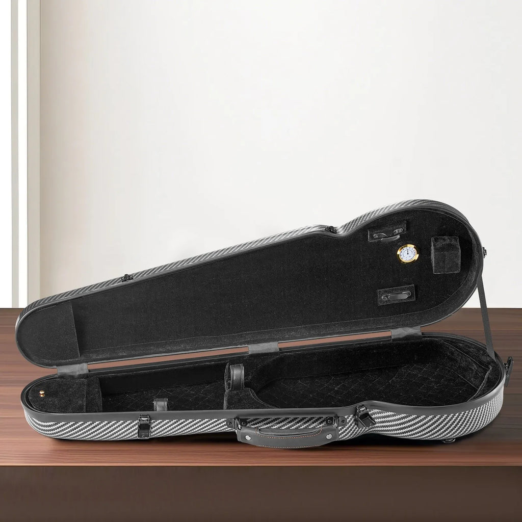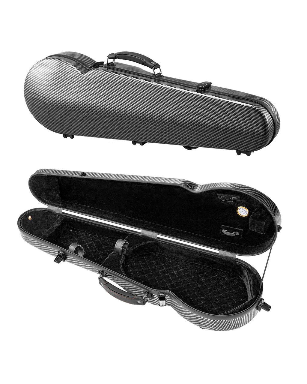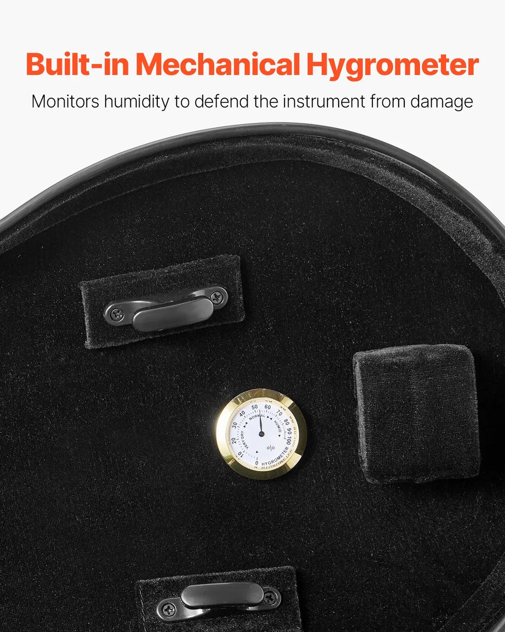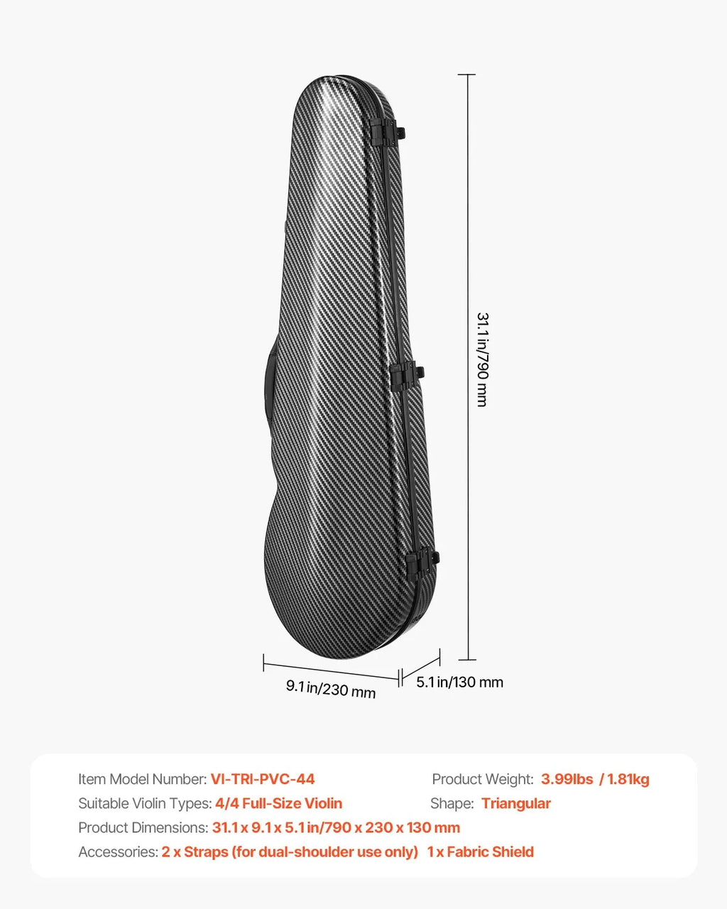 VEVOR 4/4 pilna izmēra vijoles futrālis, ar iebūvētu higrometru, viegls pārnēsājams ceļojumu somas tipa koferis, ar mīkstu plīša oderi, divām plecu siksnām, pret skrāpējumiem izturīgs, profesionāla trijstūra forma, vijolei, melns