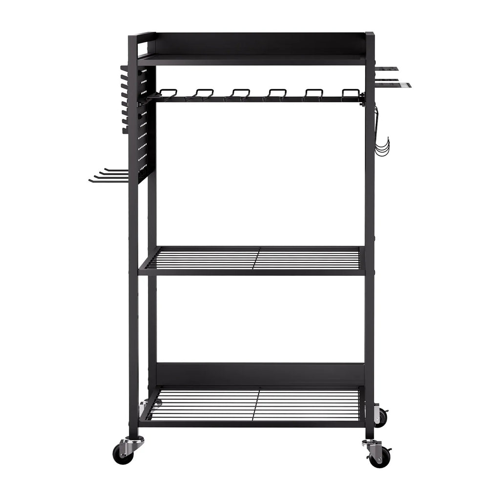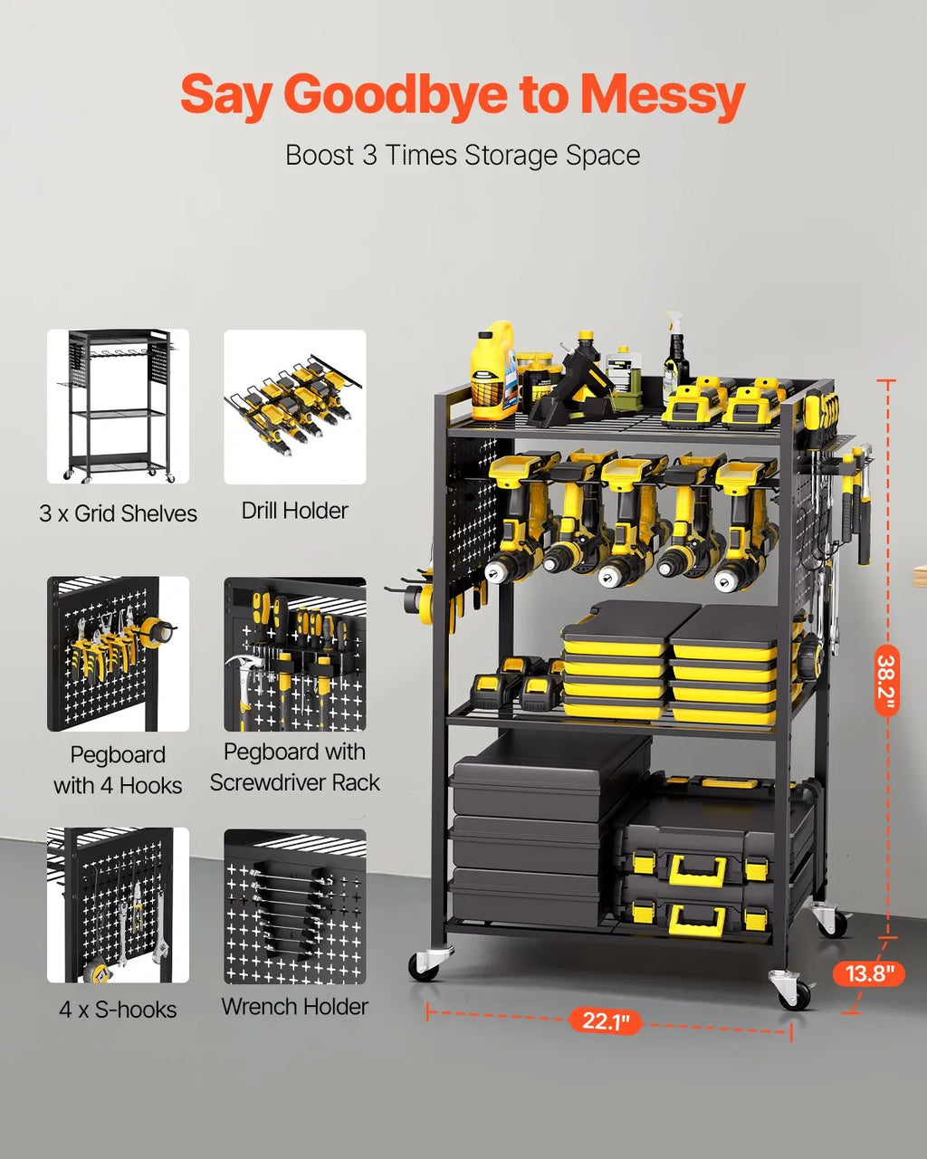 Jaudīga organizēšana Šiem 4 līmeņu instrumentu ratiem ir 3 sieta plaukti, 10 vietu urbju turētājs, DIY perforētā plate instrumentiem, skrūvgriežu turētājs, atslēgu turētājs, āķi un uzglabāšanas grozi, nodrošinot pārdomātu instrumentu un detaļu kārtošanu.