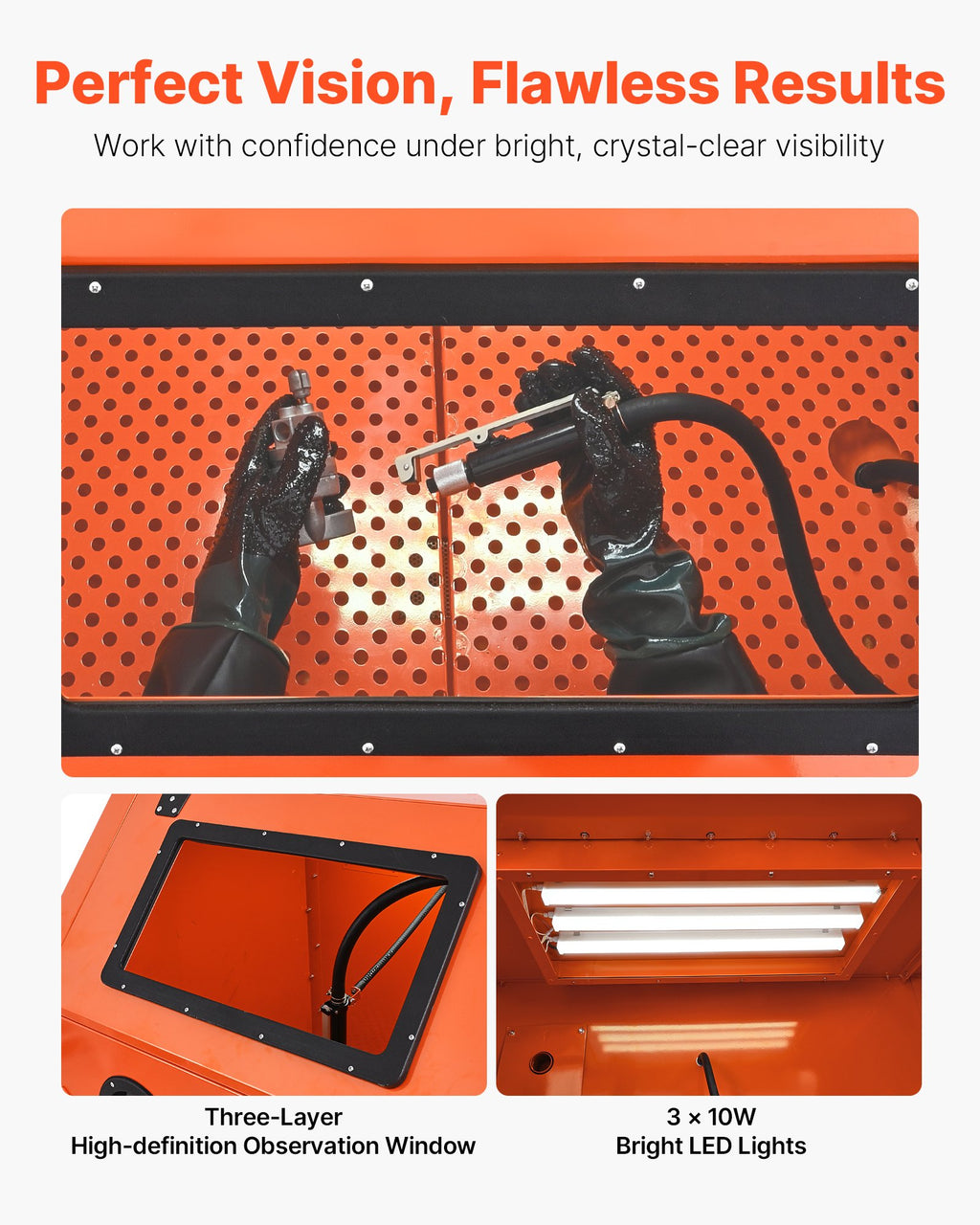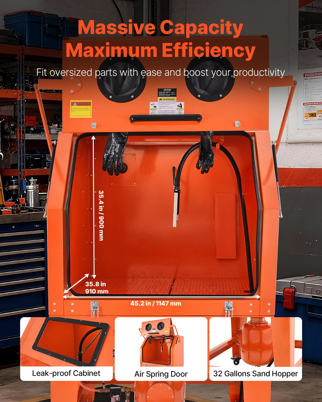 Efektīvi veiciet krāsas un rūsas noņemšanu no lielgabarīta detaļām virsmu apstrādei ar šo 927 l smilšu strūklas kabīni. Profesionālā spiedtvertne, ietilpīgā 1148 × 909 × 899 mm darba zona un jaudīgais 1,2 kW putekļu savācējs nodrošina pietiekamu vietu un augstu efektivitāti liela apjoma projektiem.