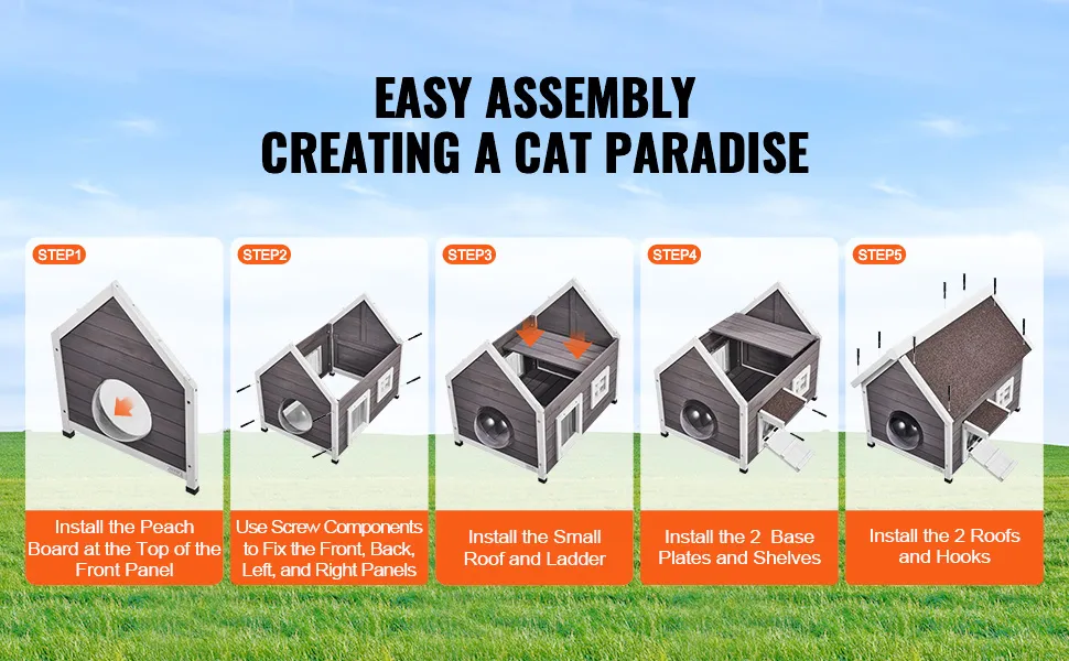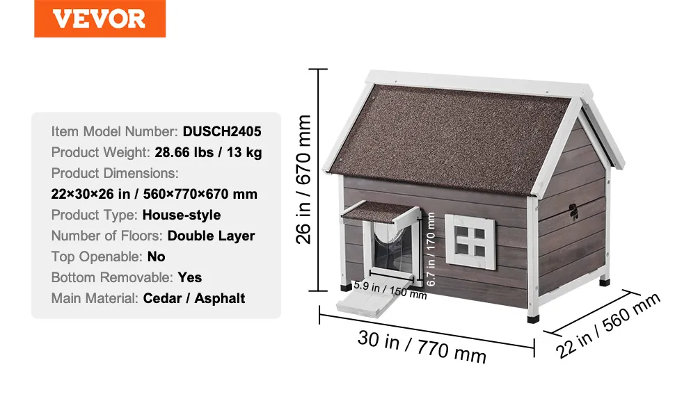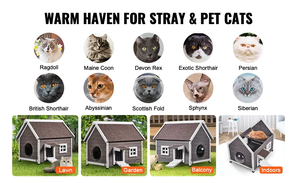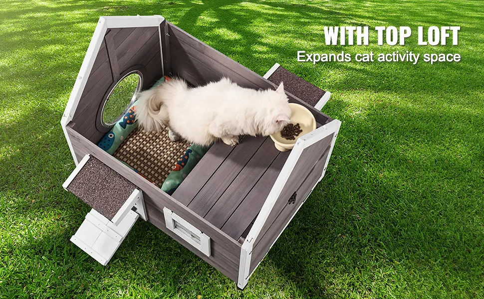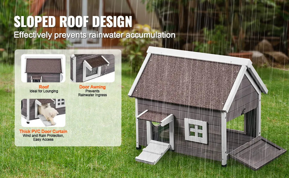 VEVOR Āra kaķu māja, laikapstākļu izturīga, patversme vairākiem kaķiem, āra koka kaķu māja ar lielām sānu durvīm, PVC durvju aizkariem, atveramu jumtu, caurspīdīgu logu, 56 cm (G) x 76 cm (P) x 66 cm (A)
