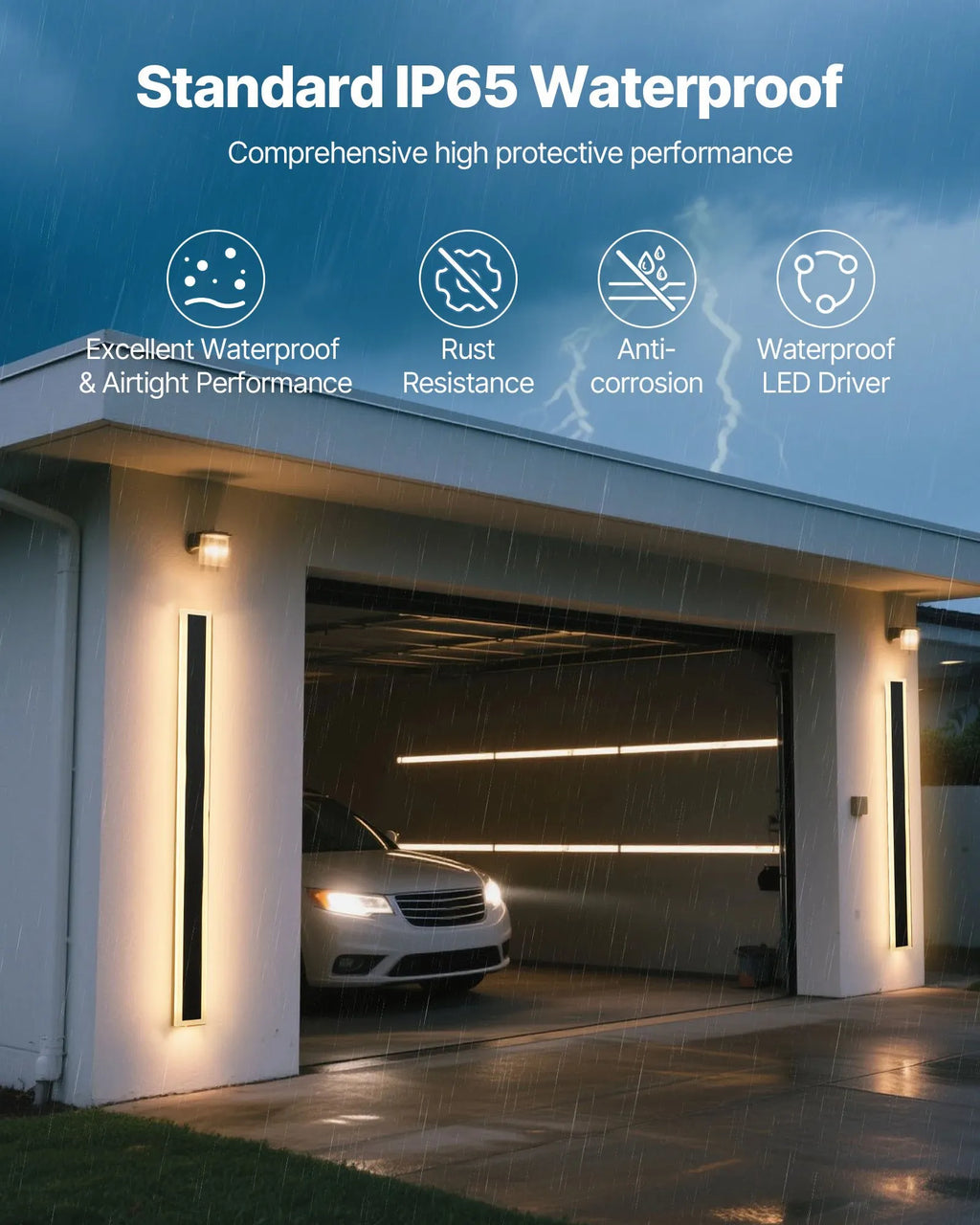 Pateicoties IP65 ūdensizturībai, mūsu āra sienas gaismeklim ir izcila ūdensnecaurlaidība un hermētiskums, kas ļauj tam izturēt ekstrēmus laikapstākļus, piemēram, vētras un spēcīgu vēju. Iebūvētais ūdensizturīgais LED draiveris nodrošina aizsardzību pret īssavienojumu un pārslodzi, garantējot uzticamu darbību.