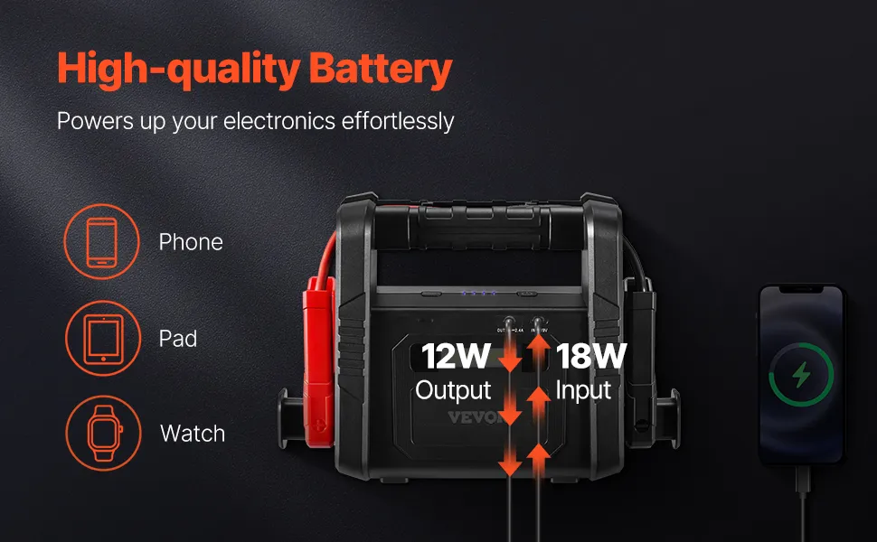 Šis automašīnas akumulatora starteris ir izstrādāts ilgstošai un uzticamai darbībai. Ar 18 W ieejas un 12 W izejas jaudu tas ļauj ērti uzlādēt ierīces ārkārtas situācijās, neuztraucoties par akumulatora izlādi.