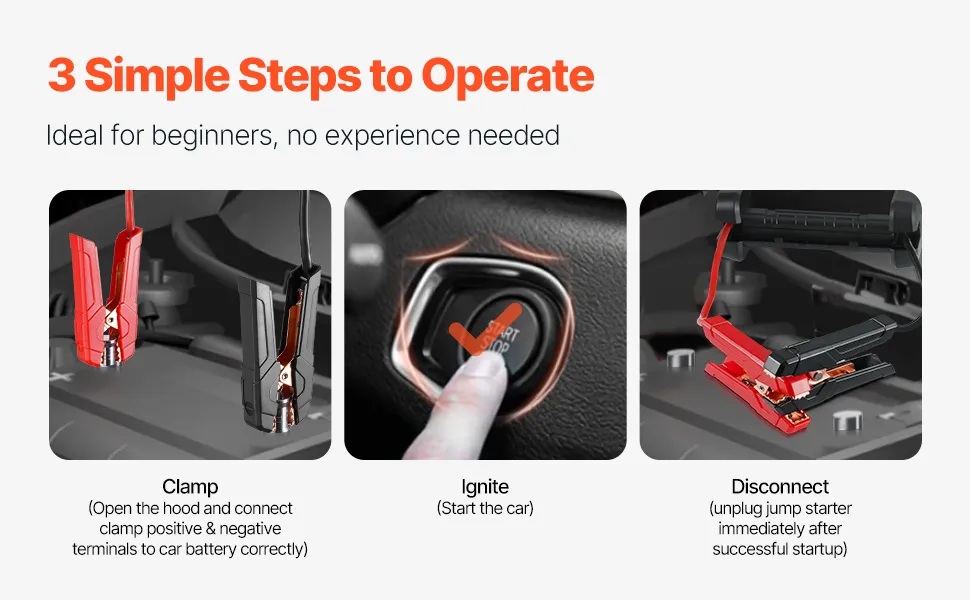 Mūsu palaišanas ierīcei nepieciešami tikai 4 vienkārši soļi, lai atkal iedarbinātu automašīnu. Pievienojiet, piekabiniet, iedarbiniet – intuitīvais dizains ir piemērots ikvienam, arī iesācējiem. Ar šo pārnēsājamo starteri varat ātri un droši atdzīvināt savu automašīnu bez liekām grūtībām ārkārtas situācijās.