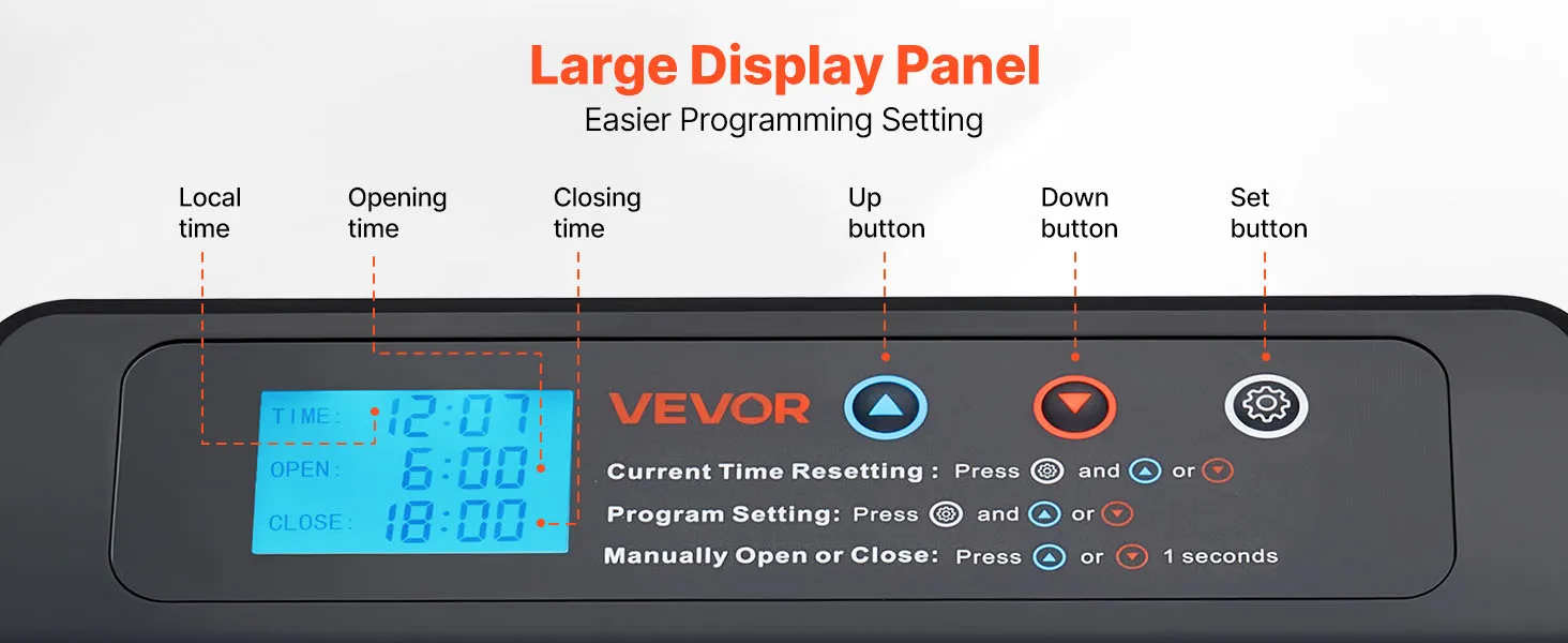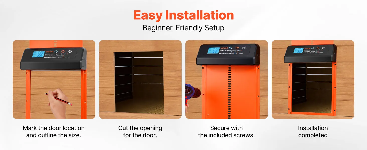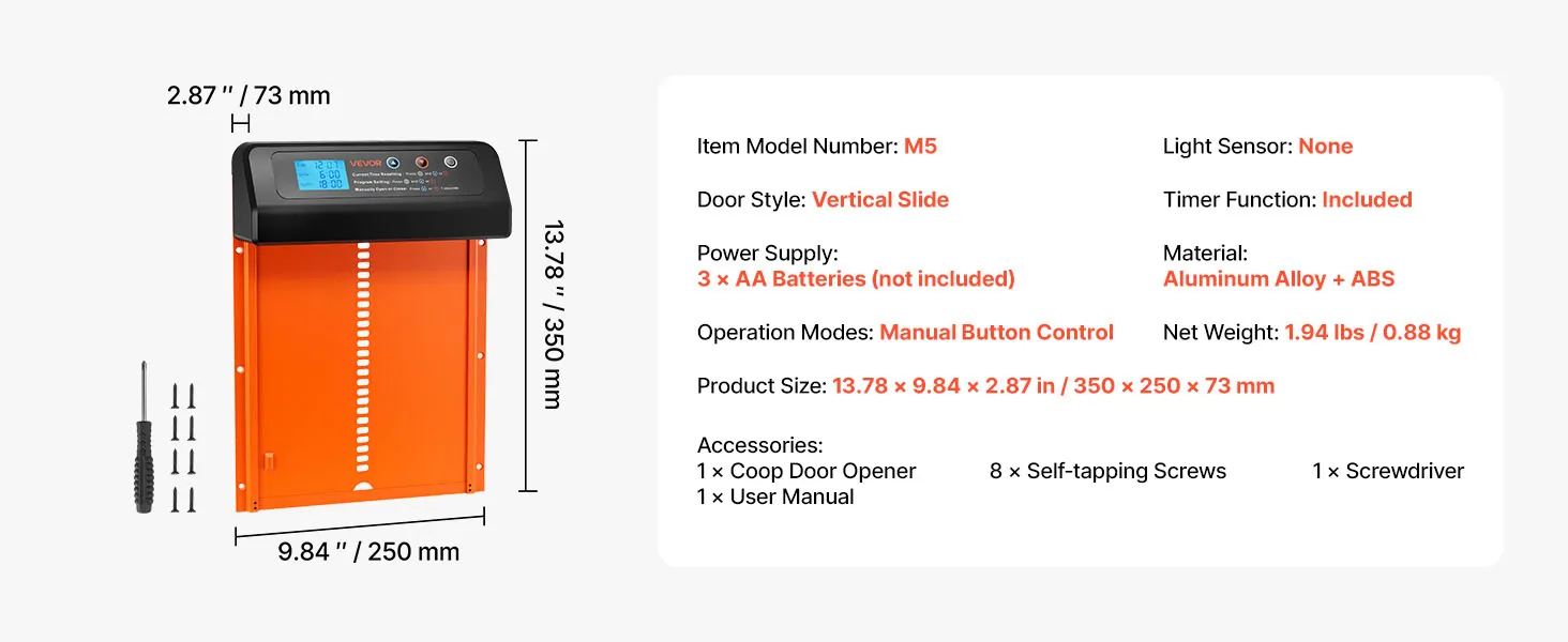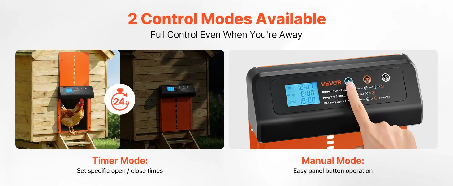 VEVOR automātiskās vistas kūts durvis, akumulatora darbināmas, ar taimeri un manuālo iestatīšanu, pretpiestiprināšanas drošību, izturīgu alumīnija sakausējumu, vistas ieejas vārtu atvērējs ar ūdensizturīgu blīvējumu, oranžas