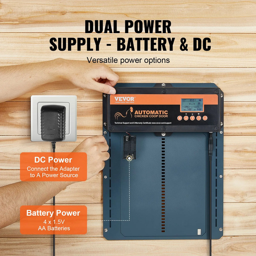 VEVOR automātiskās vistas kūts durvis ar taimeri un gaismas sensoru, alumīnija durvis ar tālvadību un LCD ekrānu, 4 atvēršanas režīmi, darbināmas ar baterijām vai DC barošanu