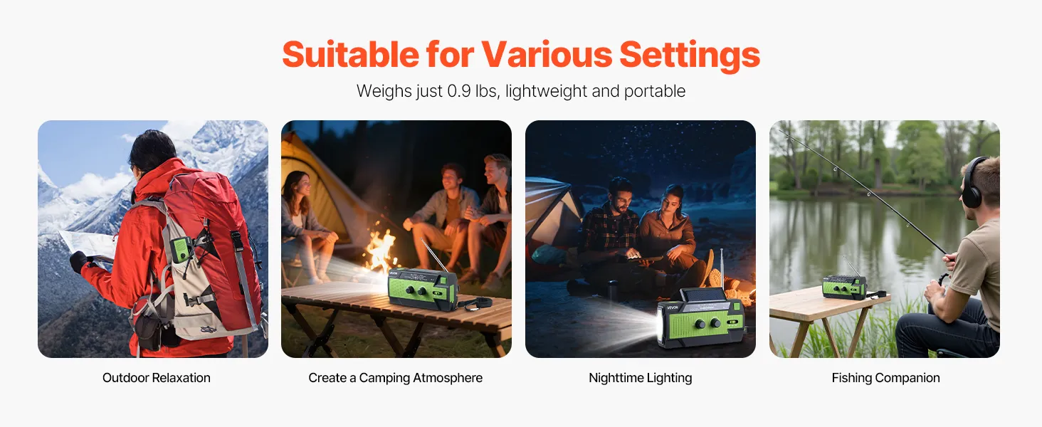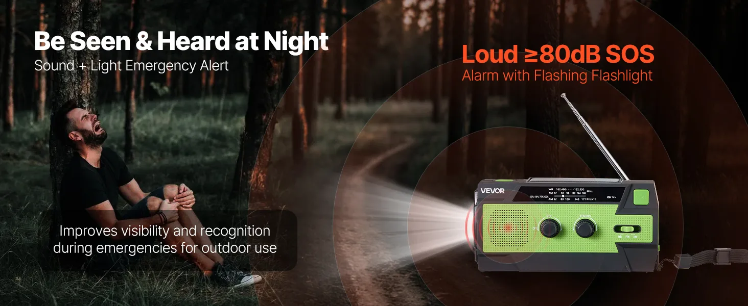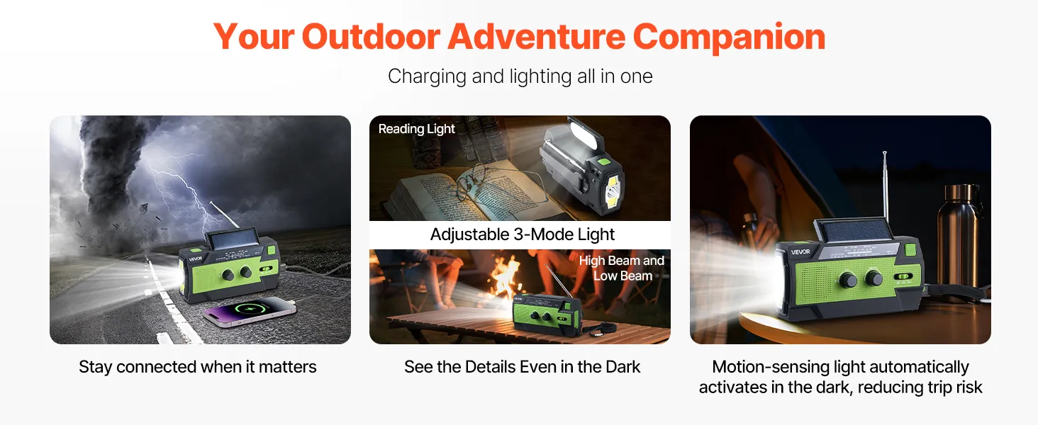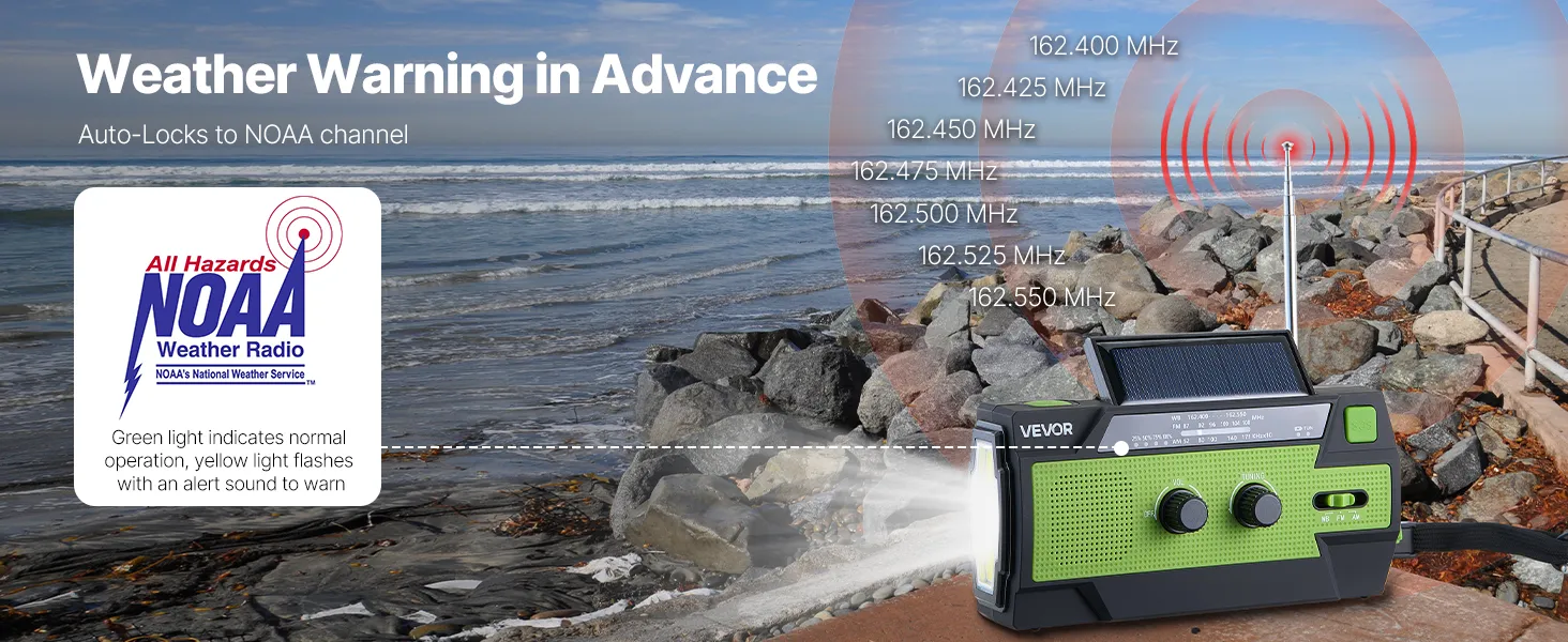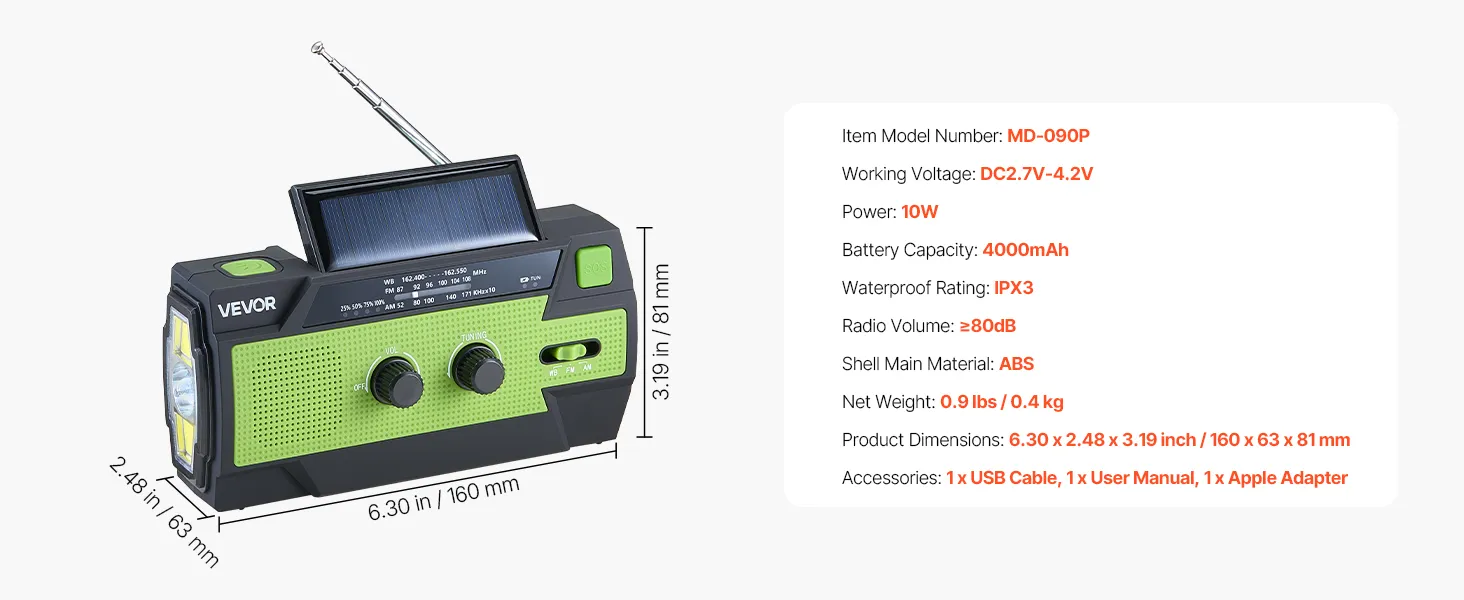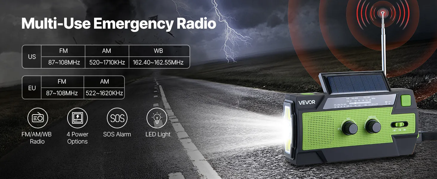 VEVOR avārijas laikapstākļu radio, 4000 mAh akumulators, FM/AM/WB/NOAA brīdinājumu uztvērējs ar saules bateriju un rokas ģeneratoru, USB uzlādes kabelis, SOS trauksmes signāls un lukturis, pārnēsājams āra un avārijas situācijām, kempingam