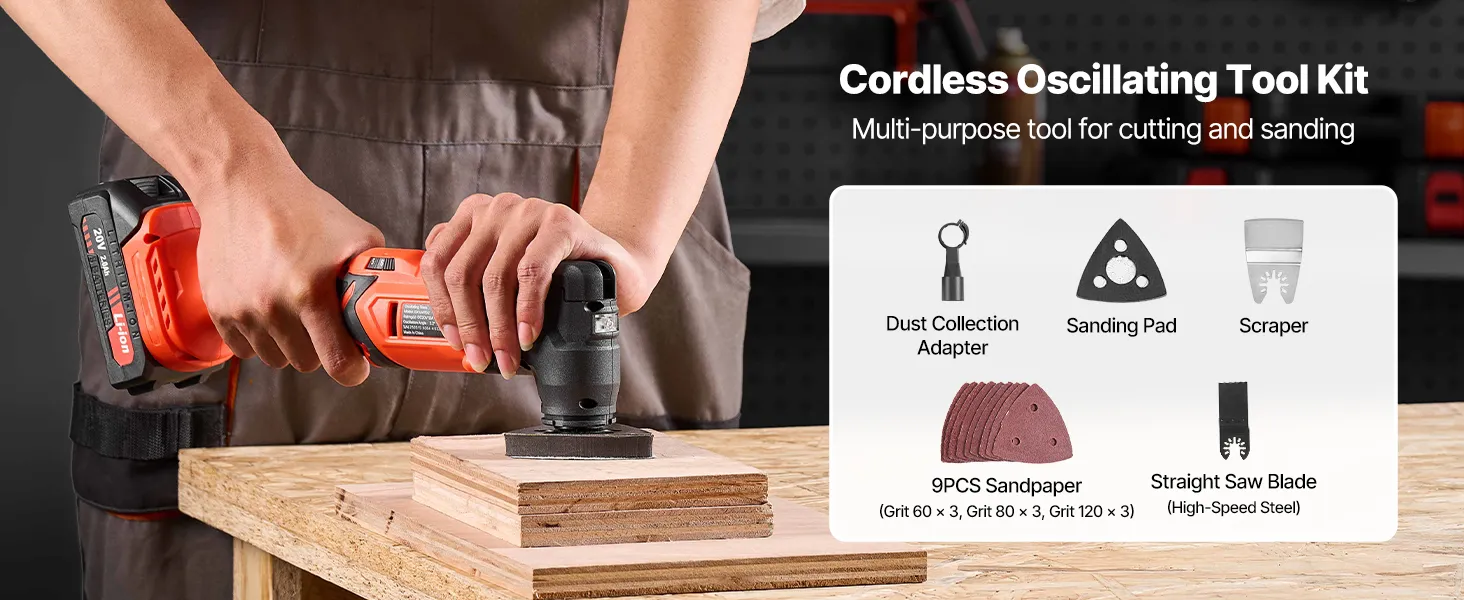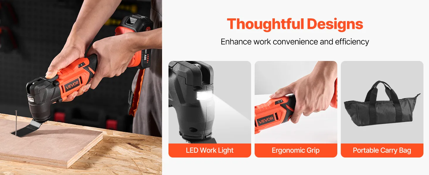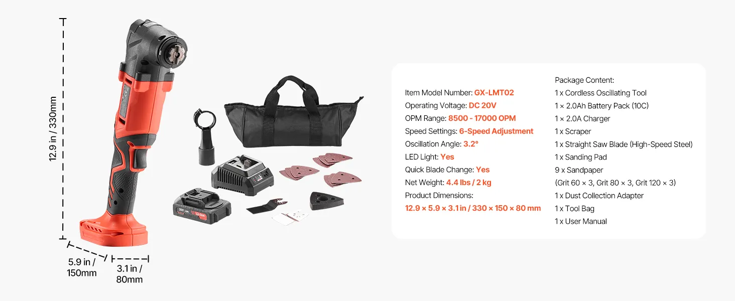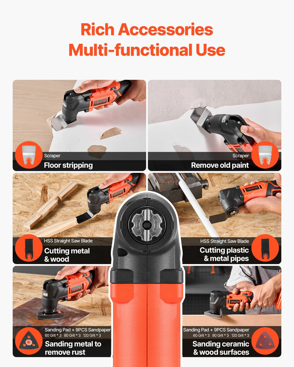 VEVOR bezvadu daudzfunkcionālais oscilējošais instruments 20 V ar 6 ātrumiem (8500–17000 OPM), 3,2° svārstību leņķi, 2,0 Ah akumulatoru un lādētāju, 12 zāģēšanas piederumiem un LED darba apgaismojumu