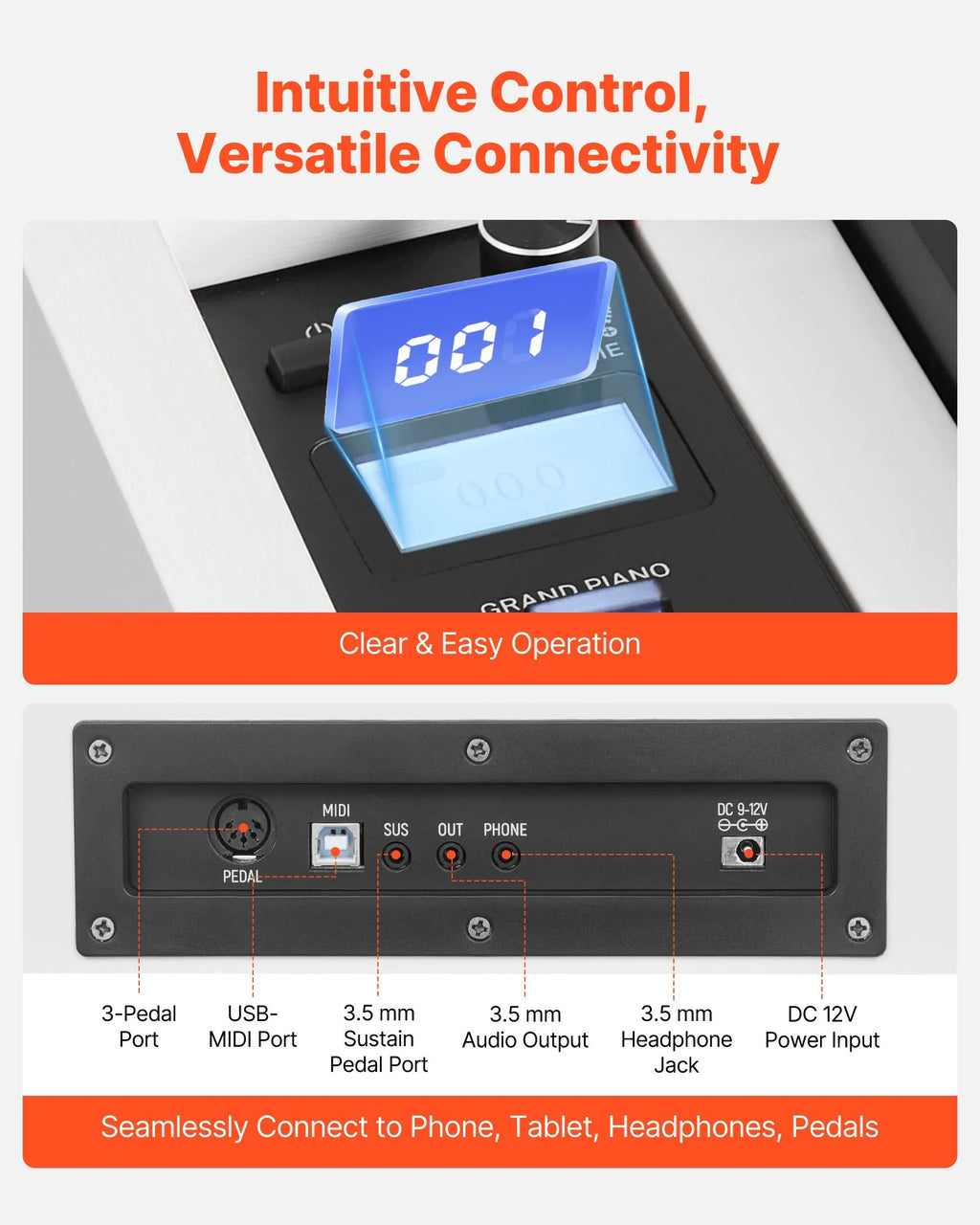Salīdzinājumā ar akustiskajām klavierēm mūsu 88 taustiņu pilnsvara klaviatūra ir vieglāka un viegli pārvietojama, ļaujot to novietot jebkurā vēlamajā vietā. Tā sniedz iespēju spēlēt kopā ar draugiem vai tuviniekiem un ērti baudīt muzikālos brīžus.