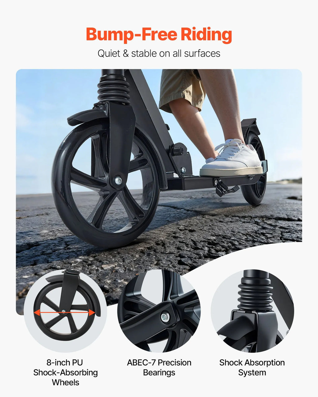 【200 mm amortizējoši riteņi】– Augstas elastības PU riteņi ar amortizācijas sistēmu nodrošina vienmērīgu un stabilu braukšanu. Piemērots asfaltam, ietvēm, koka un flīžu segumam, samazinot vibrāciju un troksni.