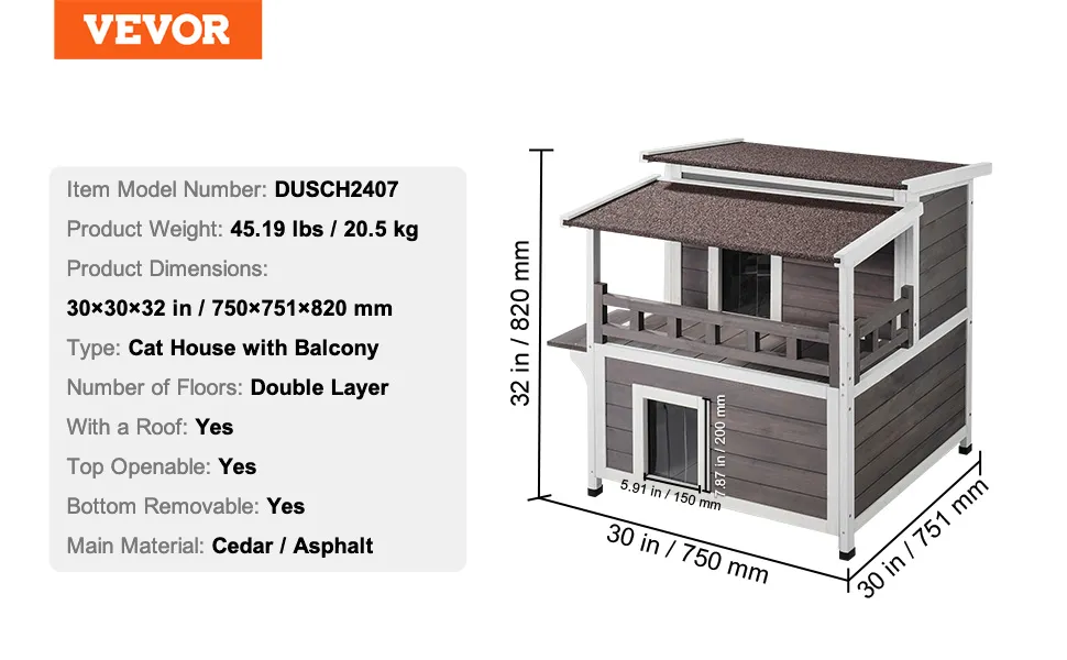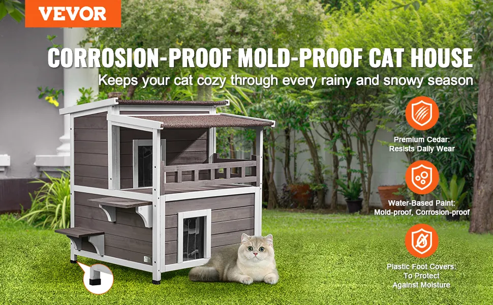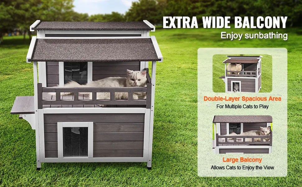 VEVOR divstāvu laikapstākļu izturīga āra koka māja kaķiem ar balkonu, durvīm, PVC aizkariem un atveramu jumtu, piemērota vairākiem kaķiem, 76.2 × 76.2 × 81.28 cm