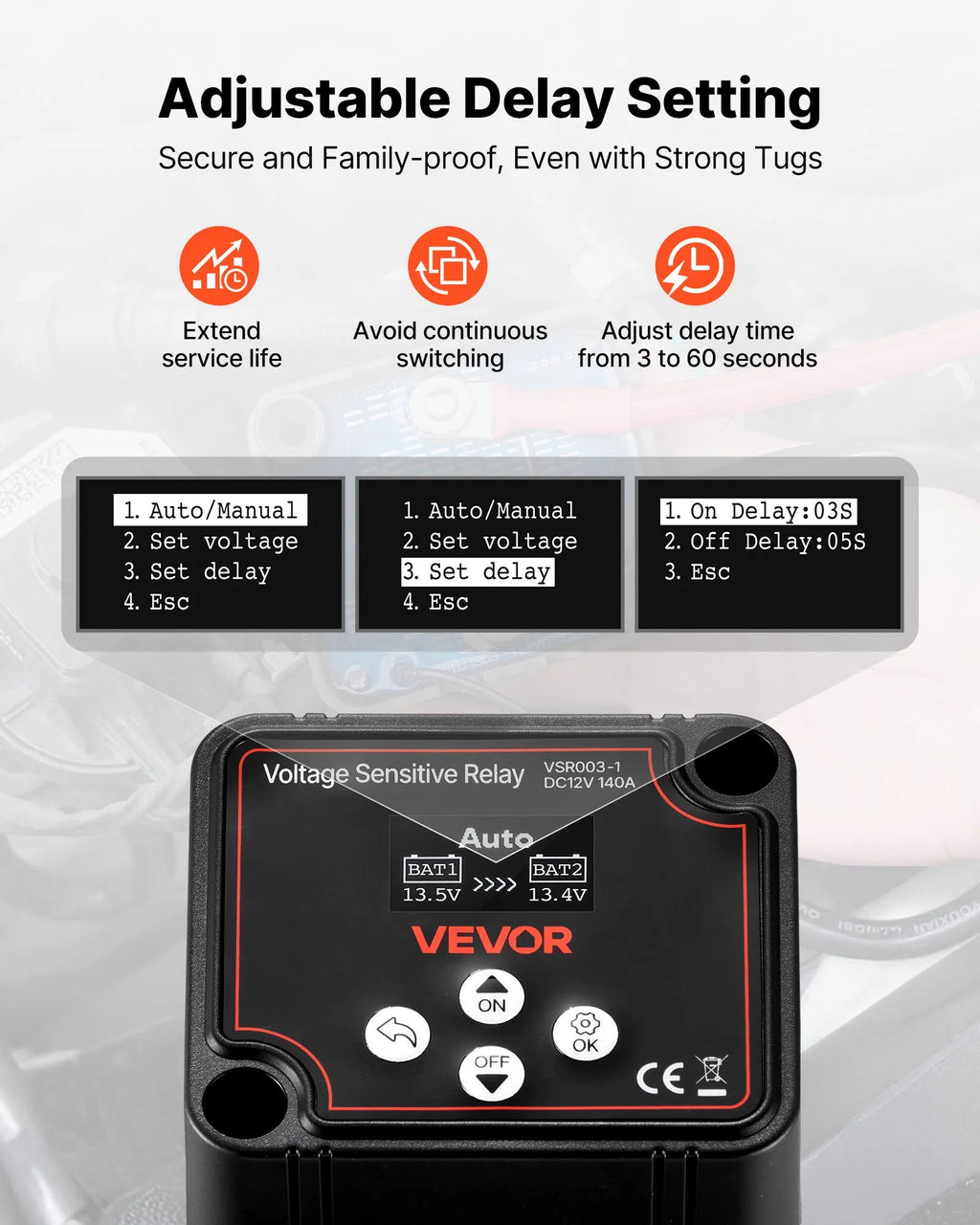 Inteliģenta aiztures funkcija: ar regulējamu aiztures laiku no 3 līdz 60 sekundēm šis VSR izolators efektīvi novērš biežu pārslēgšanos, būtiski pagarinot izolatora un akumulatoru kalpošanas laiku.