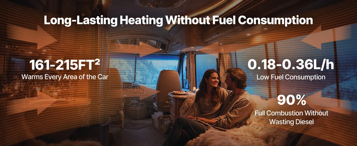 VEVOR dīzeļdegvielas sildītājs darbojas klusi un ekonomiski. Tā uzlabotais degvielas sūknis precīzi regulē plūsmu, nodrošinot vienmērīgu siltumu bez lieka patēriņa. Sildītājs patērē tikai 0,18-0,36 litrus stundā, nodrošinot apkuri visu nakti ar aptuveni 3,8 litriem dīzeļdegvielas.