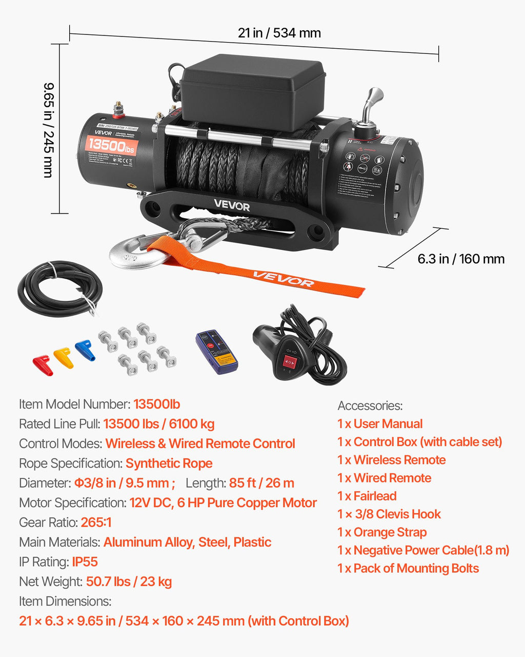 Modeļa numurs: 13500lb Nominālā vilkšanas jauda: 6100 kg Vadības režīmi: Bezvadu un vadu tālvadība Troses veids: Sintētiskā trose Motora specifikācija: 12 V līdzstrāva, 4,5 kW vara motors Pārnesuma attiecība: 265 : 1 Pamatmateriāli: Alumīnija sakausējums, tērauds, plastmasa Aizsardzības klase: IP55 Neto svars: 23 kg Izmēri: 534 × 160 × 215 mm (bez vadības bloka)