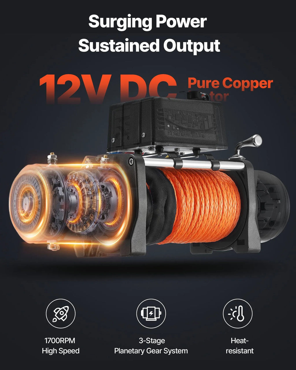 Augstas jaudas glābšana: Šīs džipa vinčas 4,0 kW motors ar 265:1 trīspakāpju planetāro pārnesumu nodrošina vienmērīgu vilkšanas spēku. Tā spēj ilgstoši darboties bez pārkaršanas, nodrošinot uzticamu jaudu bezceļu glābšanas darbos