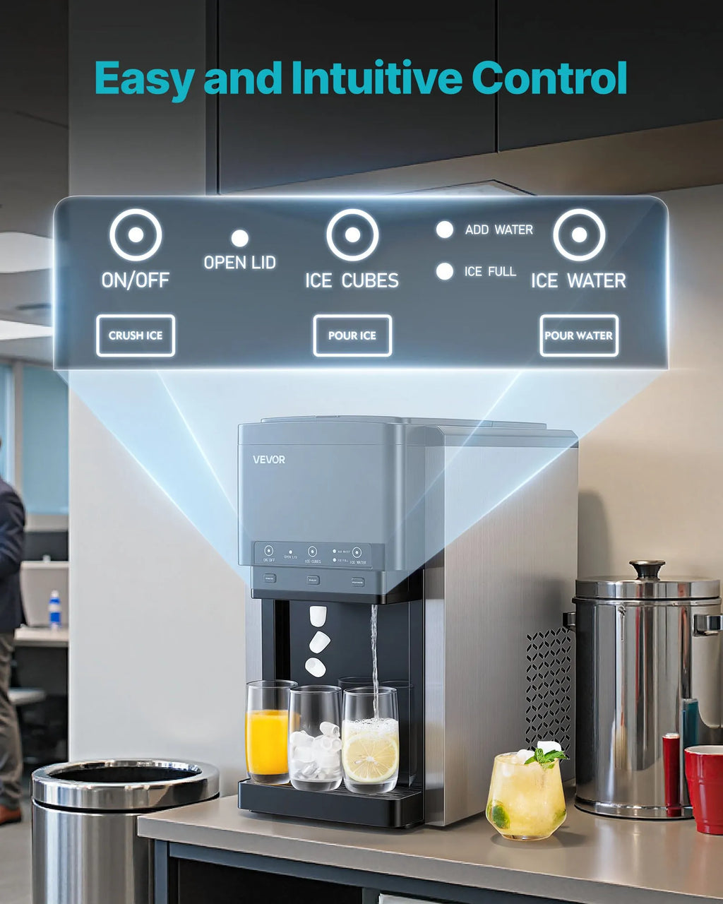 VEVOR galda ūdens dozators ar ledus automātu, 3-in-1, 16 kg/24 h ledus ražošana, 12 ledus gabaliņi 7 minūtēs, 1,8 kg uzglabāšanas ietilpība, lodīšu un sasmalcināts ledus, auksts ūdens, mājai un virtuvei