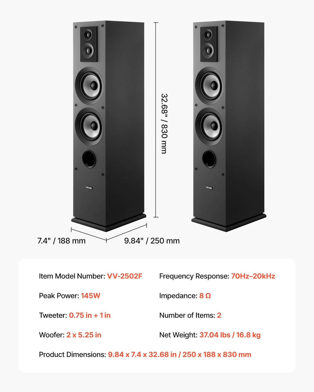 Modeļa numurs: VV-2502F Maksimālā jauda: 145 W Tviters: 1,9 cm + 2,5 cm Zemfrekvences skaļrunis: 2 × 13,3 cm Frekvenču diapazons: 70 Hz–20 kHz Pretestība: 8 Ω Daudzums iepakojumā: 2