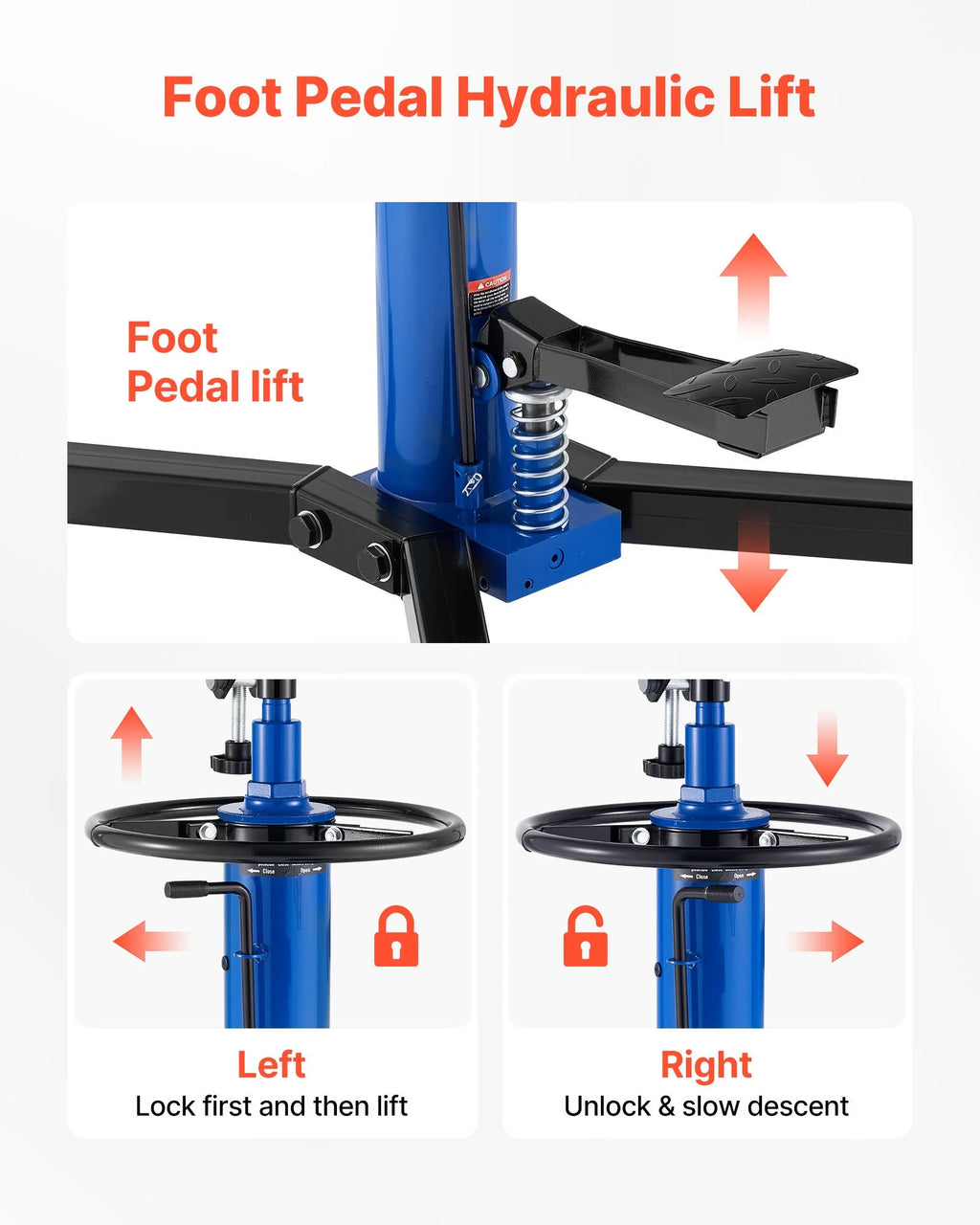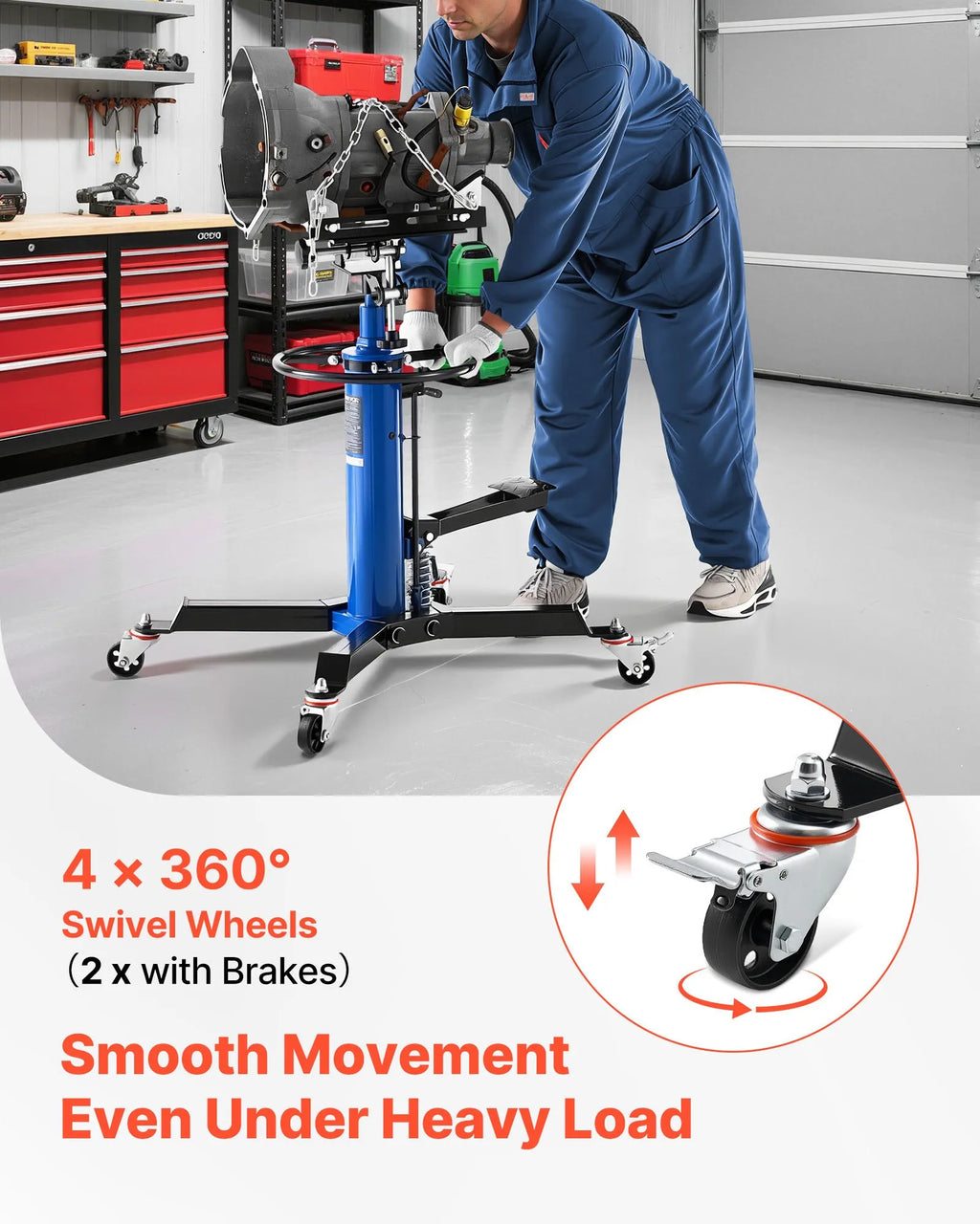 VEVOR hidrauliskais transmisijas domkrats, celtspēja 750 kg, teleskopisks transmisijas pacēlājs ar kājas pedāli un 360° grozāmiem riteņiem, pacelšanas augstums 88–176 cm, paredzēts garāžām un autoservisiem