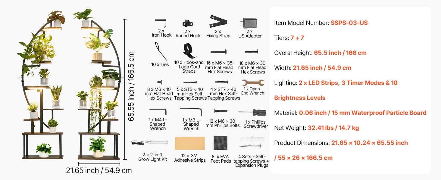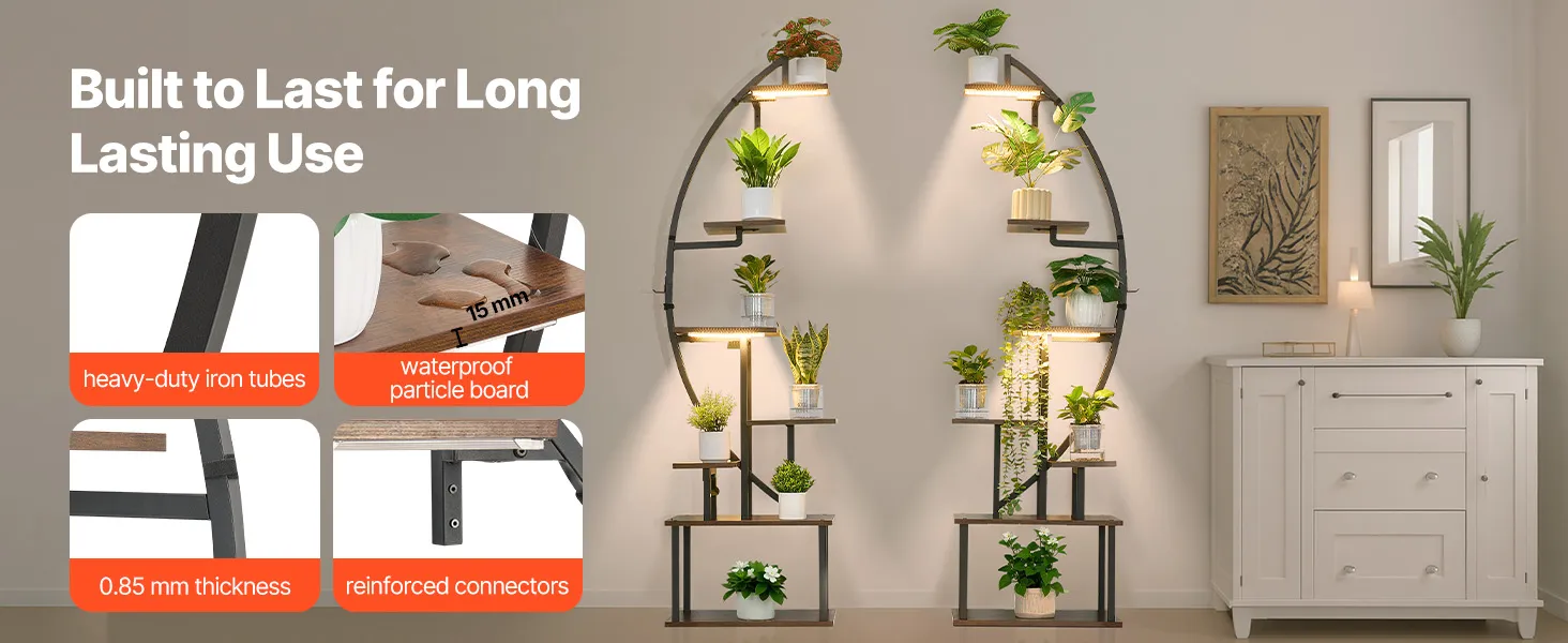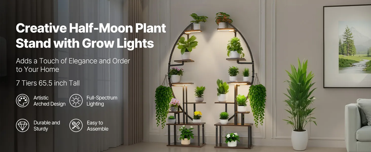 VEVOR iekštelpu augu statīvs ar audzēšanas apgaismojumu, 166,5 cm augsts, 7 līmeņu pusmēness formas metāla plaukts (2 gab. komplekts) ar taimera funkciju (3 režīmi) un 10 spilgtuma līmeņiem, piemērots ziedu un augu ekspozīcijai dzīvojamā telpā.