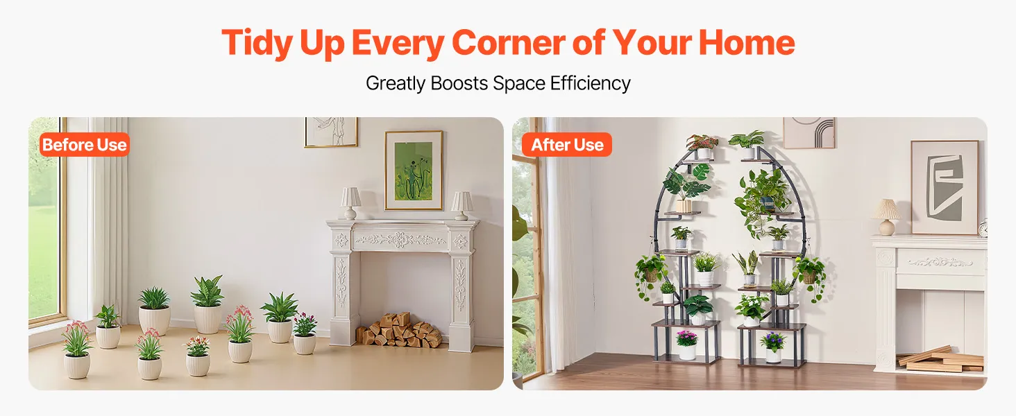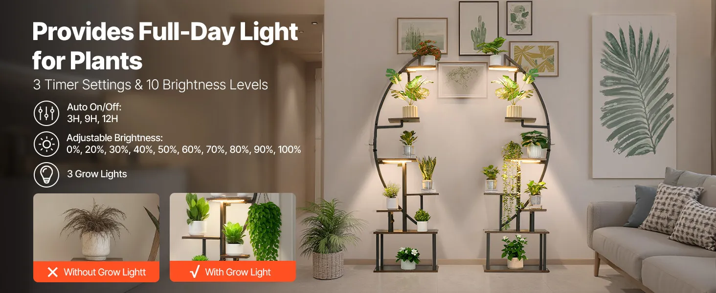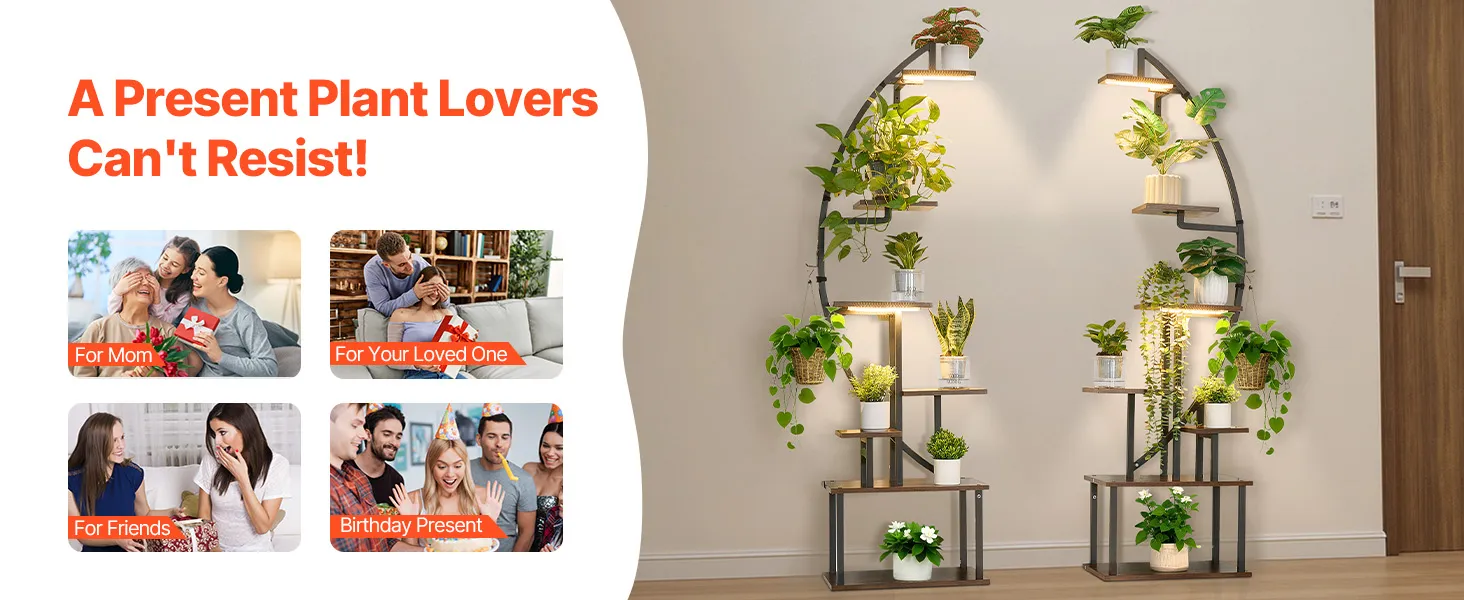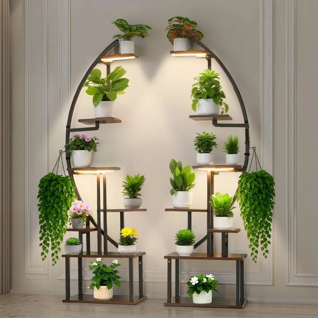 VEVOR iekštelpu augu statīvs ar audzēšanas apgaismojumu, 166,5 cm augsts, 7 līmeņu pusmēness formas metāla plaukts (2 gab. komplekts) ar taimera funkciju (3 režīmi) un 10 spilgtuma līmeņiem, piemērots ziedu un augu ekspozīcijai dzīvojamā telpā.