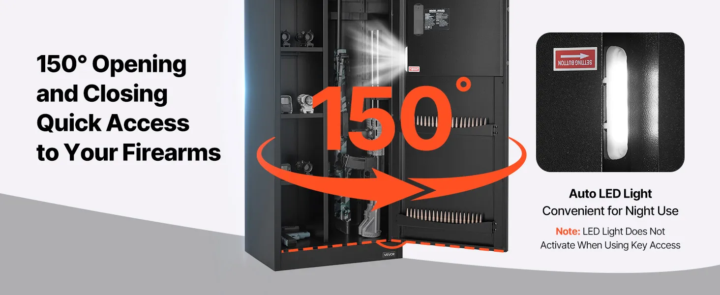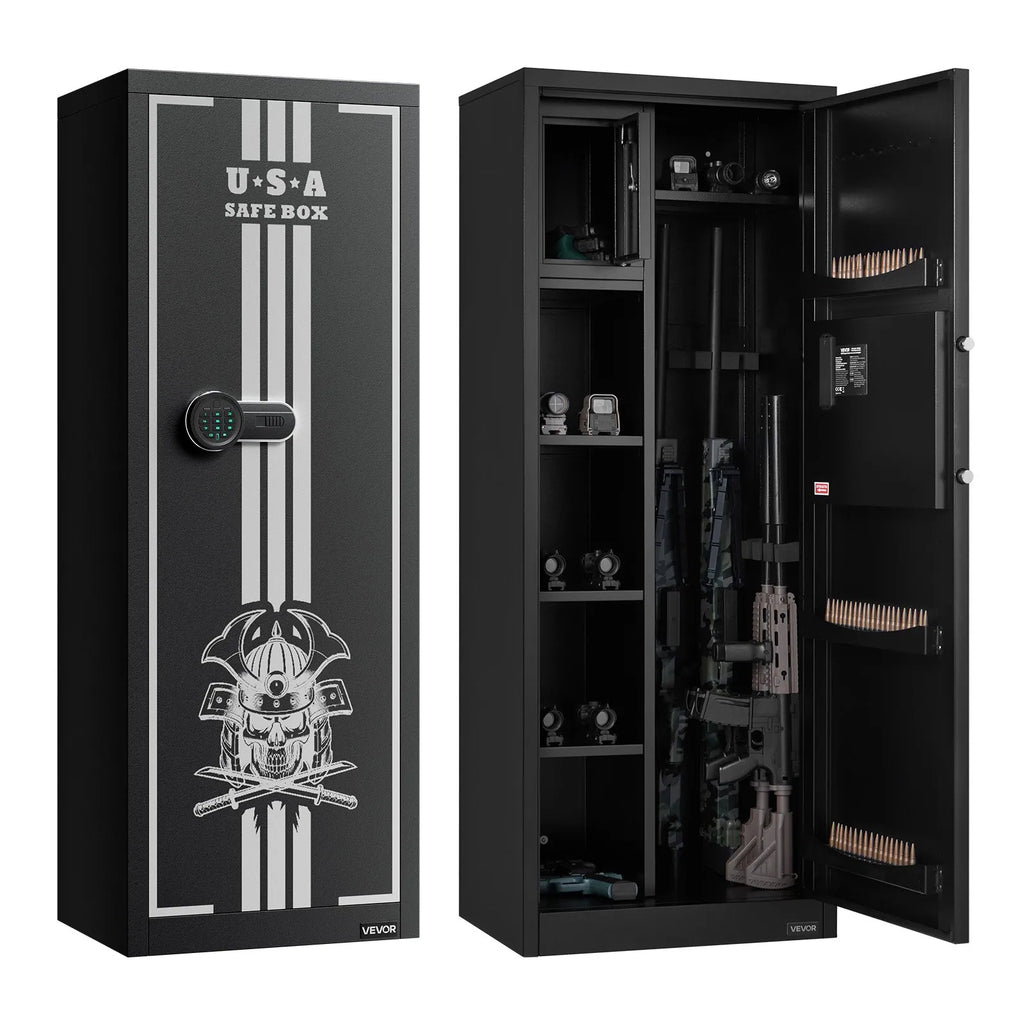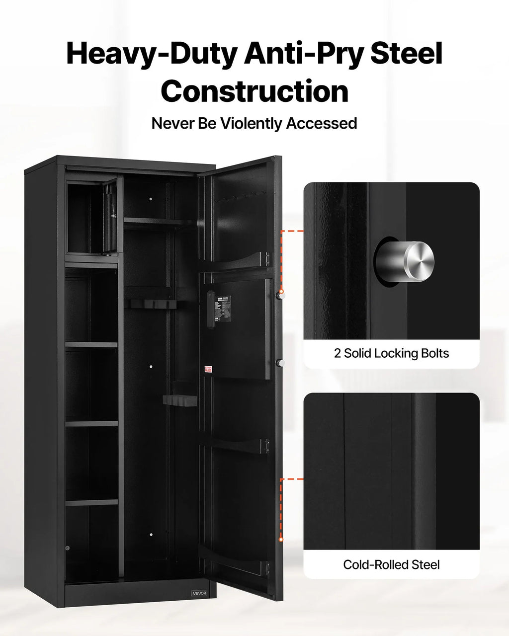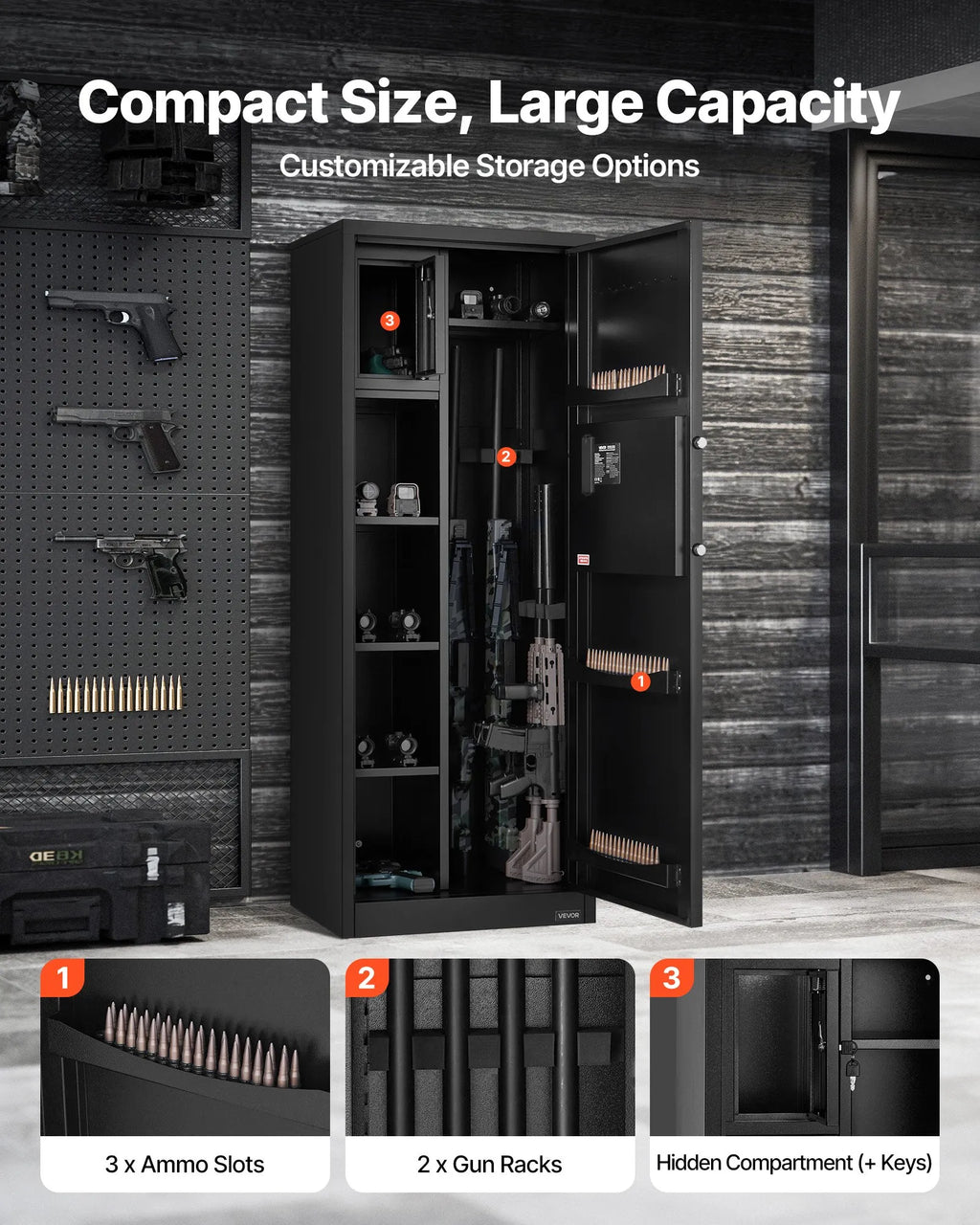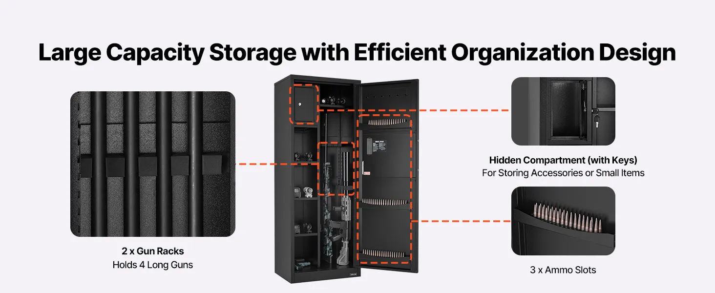 VEVOR ieroču seifs 4 šautenēm, garo ieroču un pistoles skapis, ātrās piekļuves šauteņu seifs ar 3 patronu nodalījumiem un 2 regulējamām turētāju rindām, liels digitālais seifs ar atslēgas un paroles slēdzeni