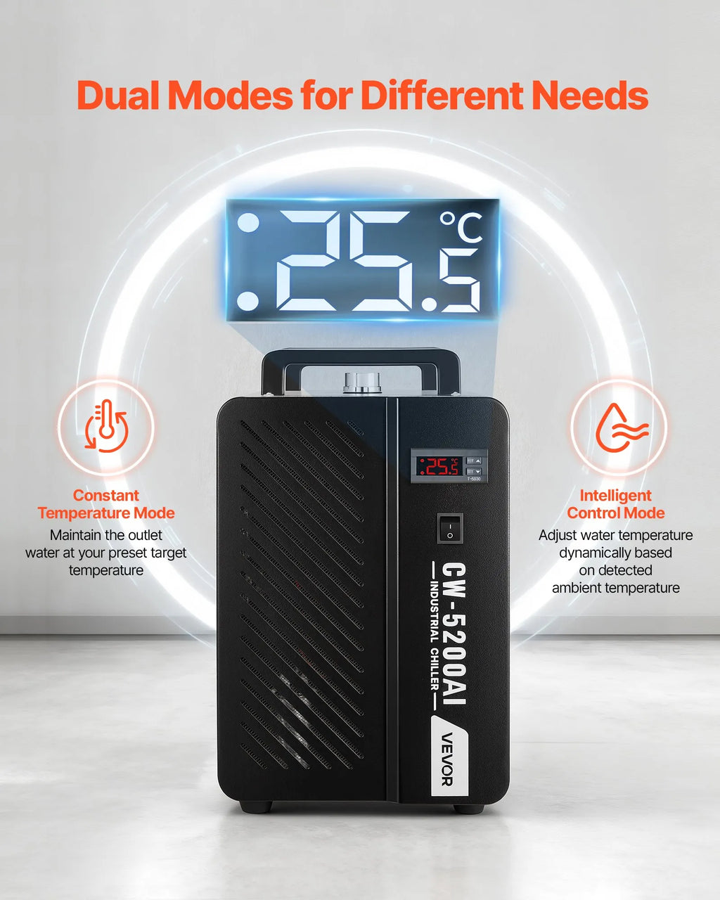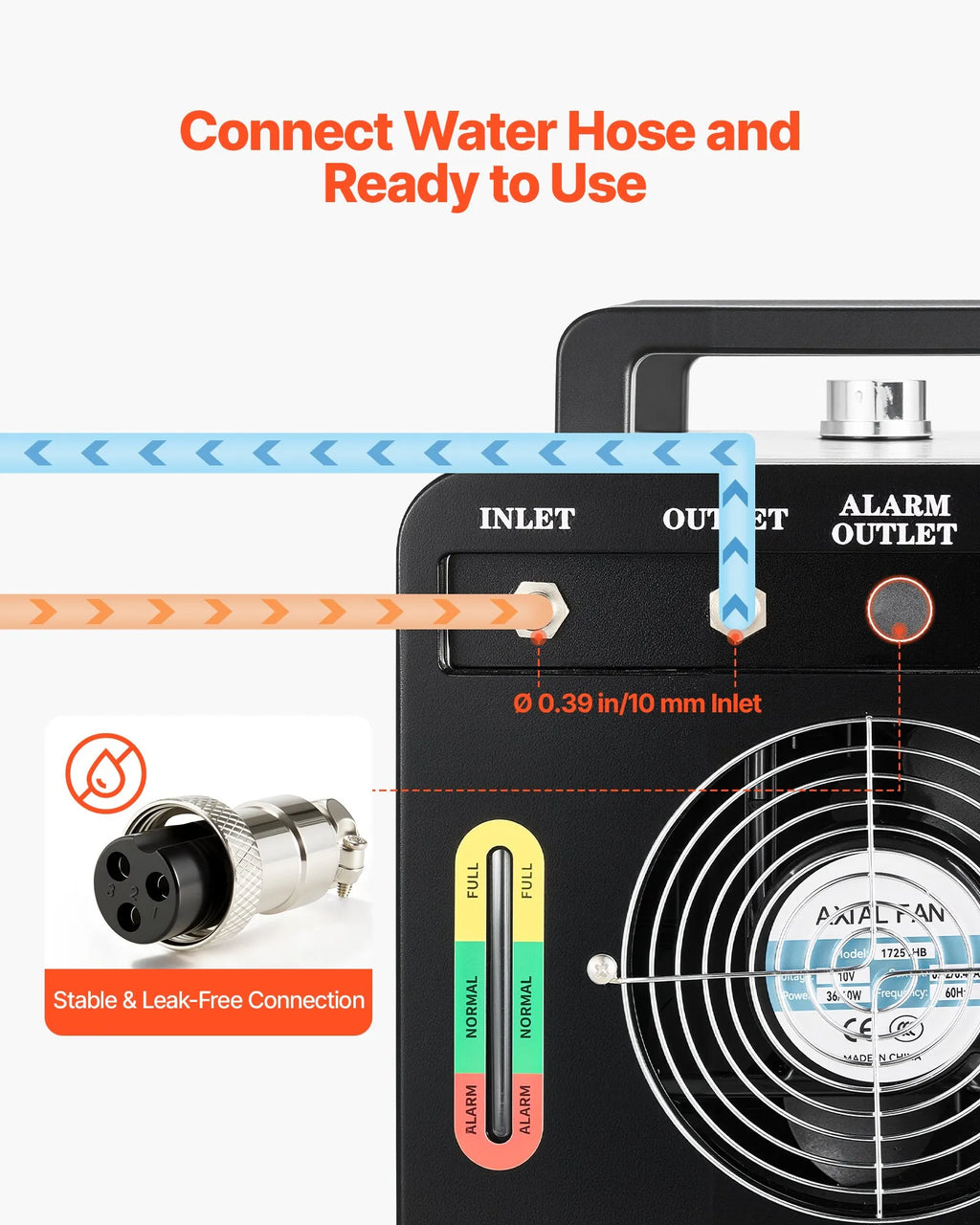 VEVOR industriālais ūdens dzesētājs, 1600 W, industriāla ūdens dzesēšanas sistēma ar kompresoru, maksimālais plūsmas ātrums 16 l/min, 7 l tvertnes ietilpība, lāzera dzesētājs CO₂ lāzera cauruļu gravēšanas un griešanas iekārtām