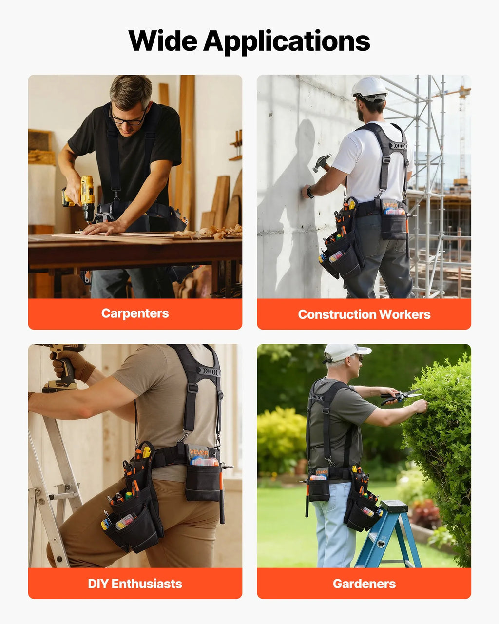 VEVOR instrumentu josta ar 19 kabatām un lencēm, pastiprināta regulējama darba josta ar noņemamu plecu stiprinājumu elektriķiem, galdniekiem un būvniecībai, vidukļa apkārtmērs 80–131 cm