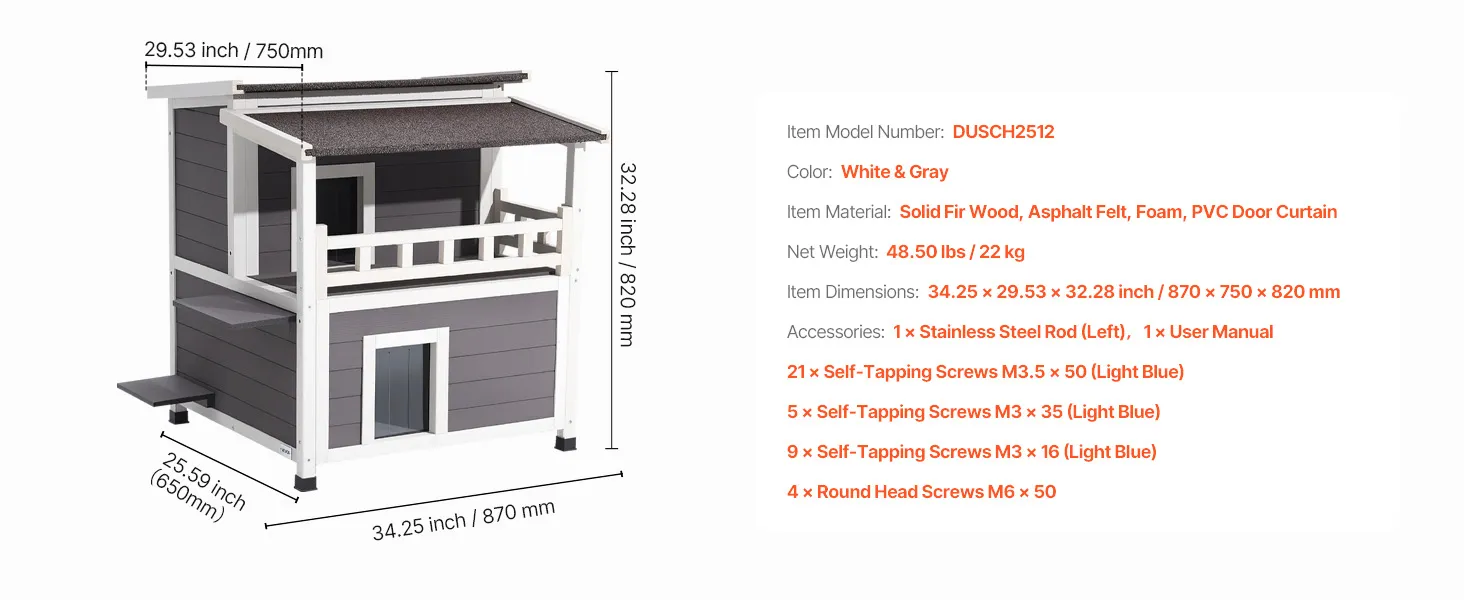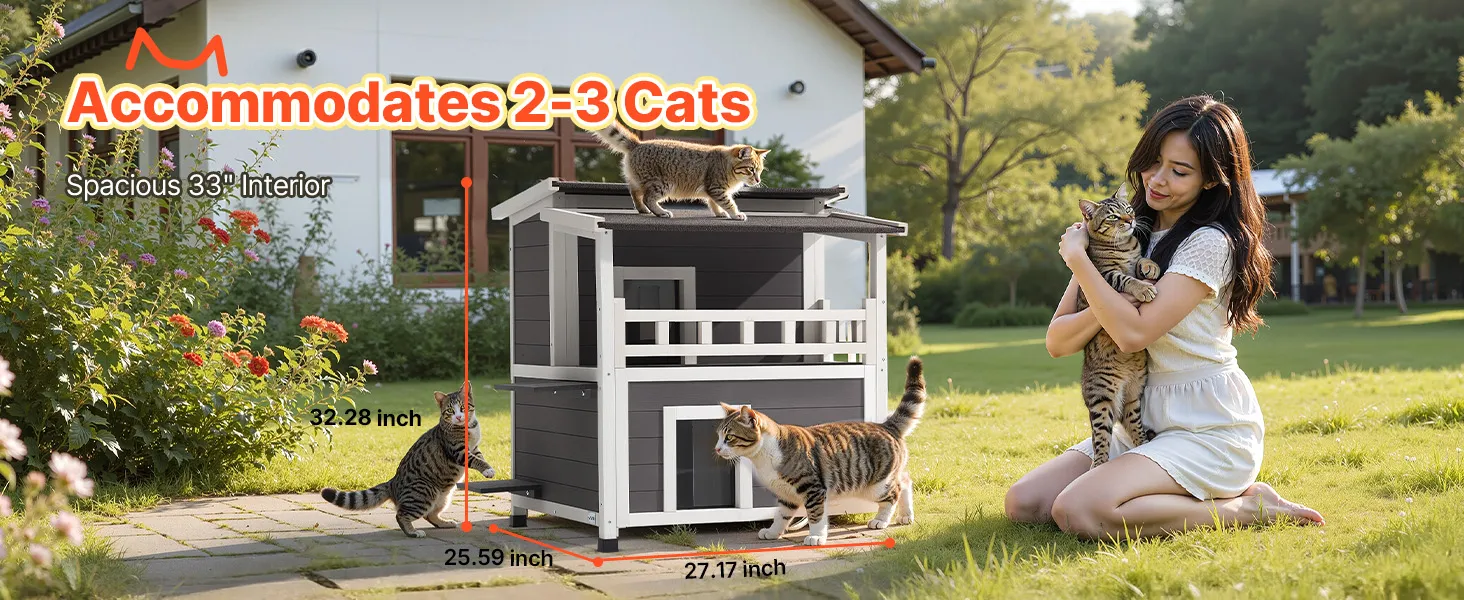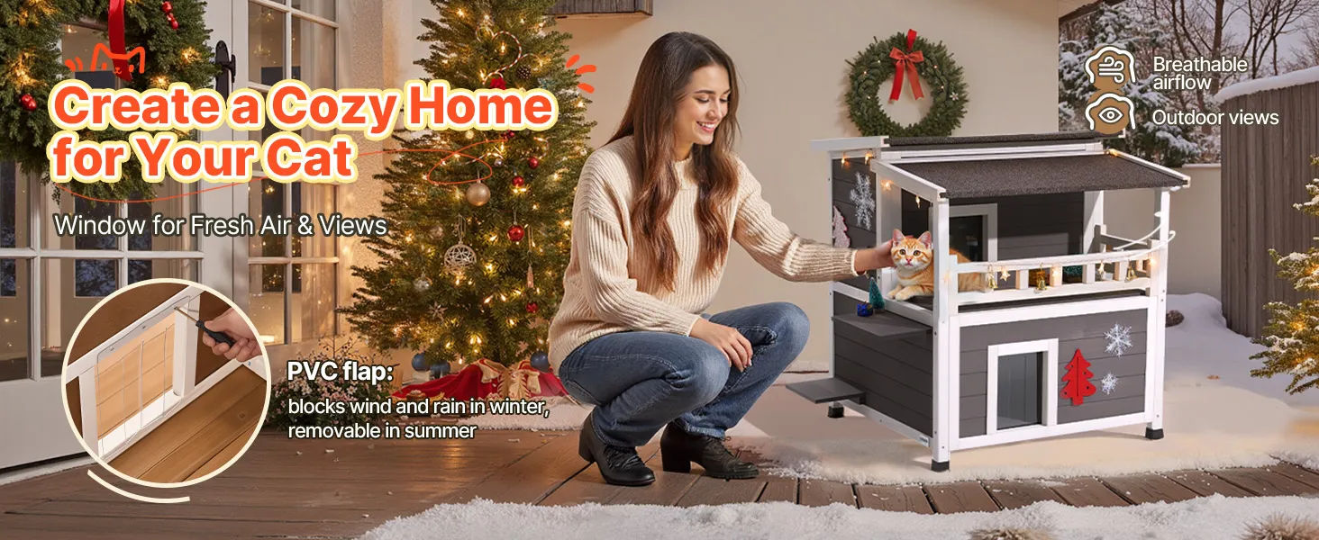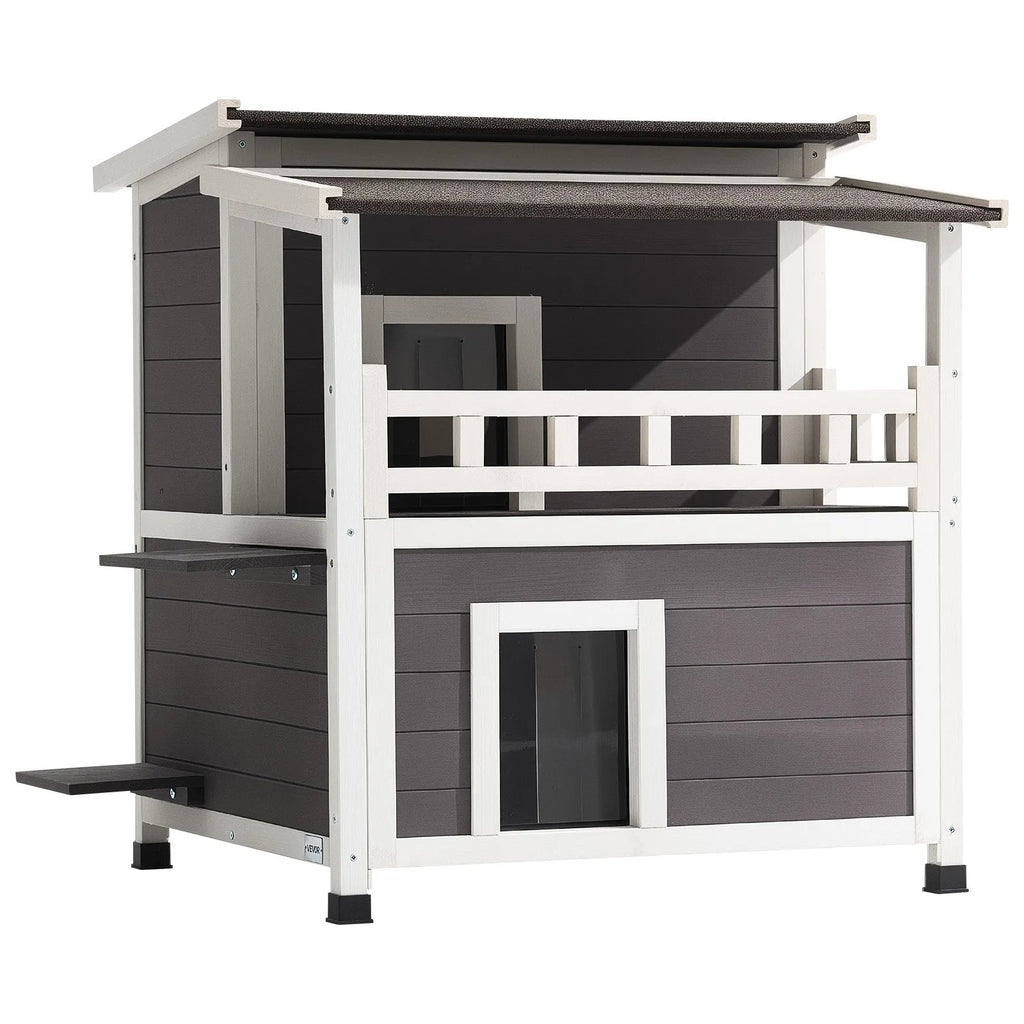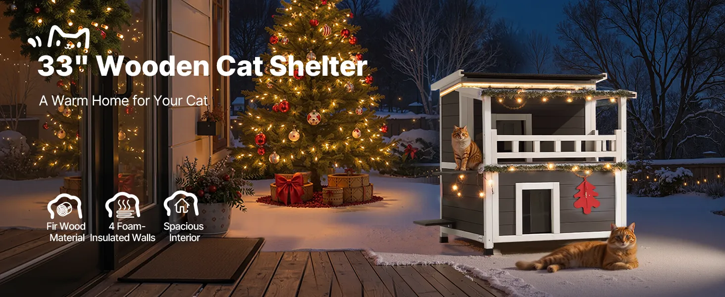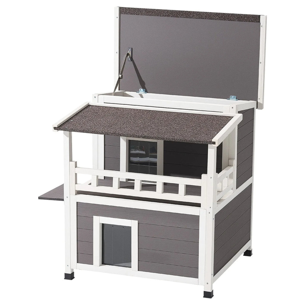 Izgatavota no kvalitatīva egles koka, šī aptuveni 84 cm koka kaķu māja ir ilgtspējīga un izturīga. Četrpusējā putuplasta izolācija uztur kaķus siltumā aukstā laikā, savukārt plašais iekšējais izkārtojums nodrošina vietu kāpelēšanai un rotaļām.