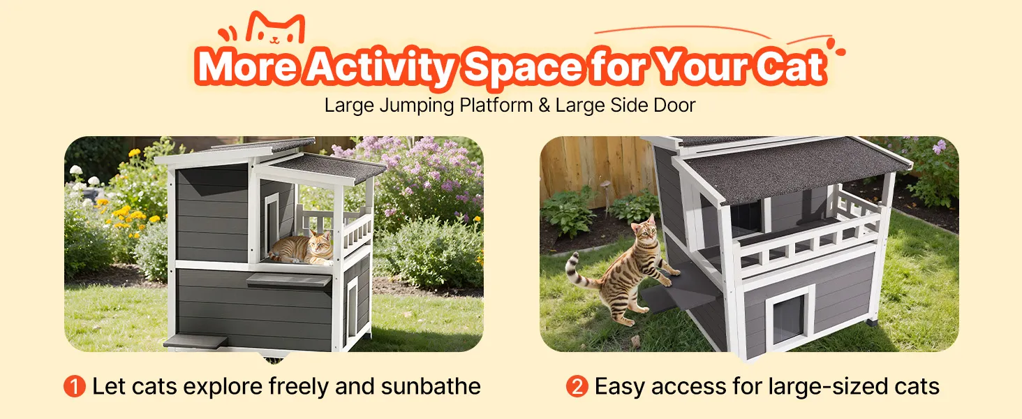 Šai paceltajai kaķu mājai ir liela sānu ieeja, kas to padara piemērotu lielākiem kaķiem vai vairāku kaķu saimēm. Paaugstinātā lēkšanas platforma nodrošina kaķiem papildu vietu kāpelēšanai, izpētei un sauļošanai.