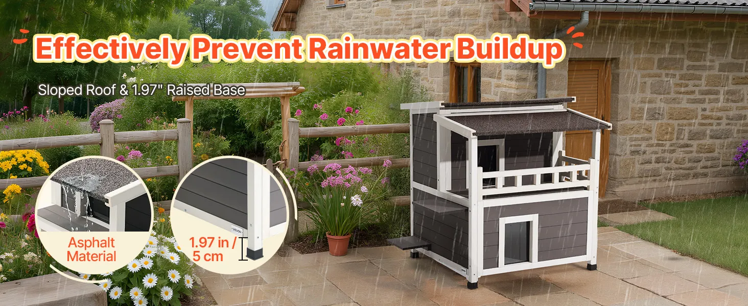 Laikizturīga un izturīga konstrukcija: Izgatavota no masīvkoka egles paneļiem ar asfaltētu jumtu, šī āra kaķu māja nodrošina lielisku izturību pret lietu, sniegu, vēju un sauli. Slīpais jumts un 5 cm paaugstinātās kājas novērš ūdens uzkrāšanos, uzturot mājiņu sausu un mājīgu.