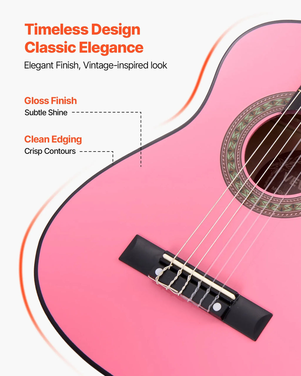 Klasisks retro dizains: Šai koka klasiskajai ģitārai ir rūpīgi veidots pārklājums ar izturīgu apdari un precīzu apdari savienojumos, kas nodrošina papildus izturību un triecienu noturību. Optimālais stīgu un ladu attālums samazina pirkstu nogurumu un padara to piemērotu iesācējiem.