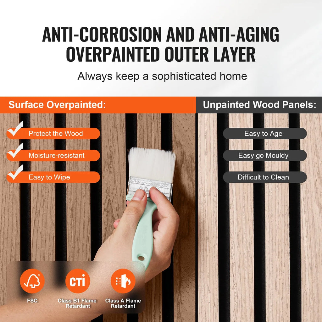 Šiem akustiskajiem sienas paneļiem ir trīsslāņu struktūra, kas apvieno koka tekstūras laminātu, MDF materiālu un augsta blīvuma poliestera šķiedru. Formaldehīda emisija atbilst E0 standartam, bet A klases ugunsdrošības reitings nodrošina drošu un videi draudzīgu lietošanu.