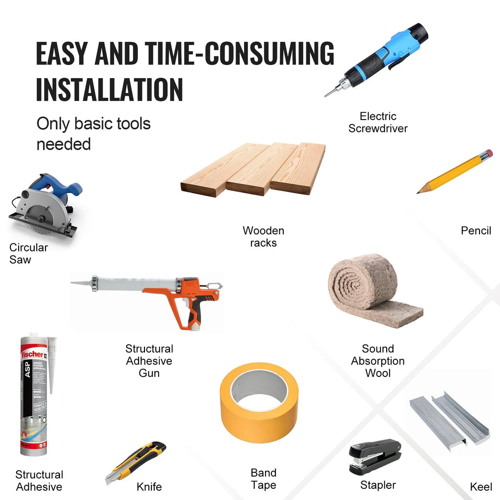 Paneļi ir paredzēti ātrai un vienkāršai montāžai, un tos var uzstādīt gan uz sienām, gan griestiem, izmantojot pamata instrumentus. Tas ļauj iegūt profesionāla līmeņa akustiskos ieguvumus bez sarežģītas uzstādīšanas.