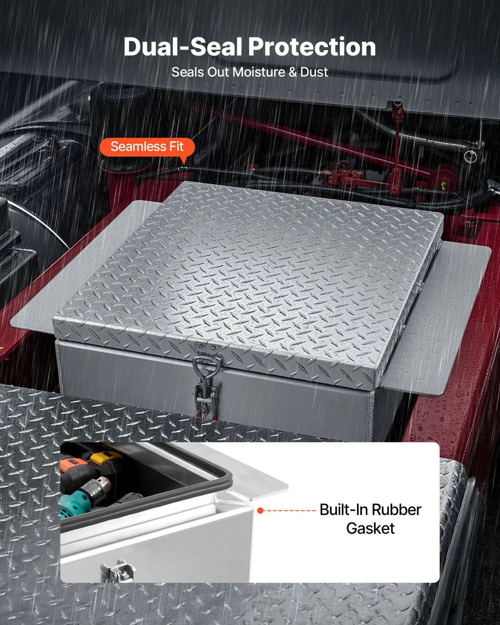 VEVOR kravas kastes instrumentu kaste, izturīga alumīnija instrumentu kaste ar rievotu (diamond plate) vāku, maksimālā slodze 100 kg, paredzēta pikapiem, kravas auto kastēm, kemperiem un piekabēm, 770 × 610 × 310 mm, sudraba krāsā