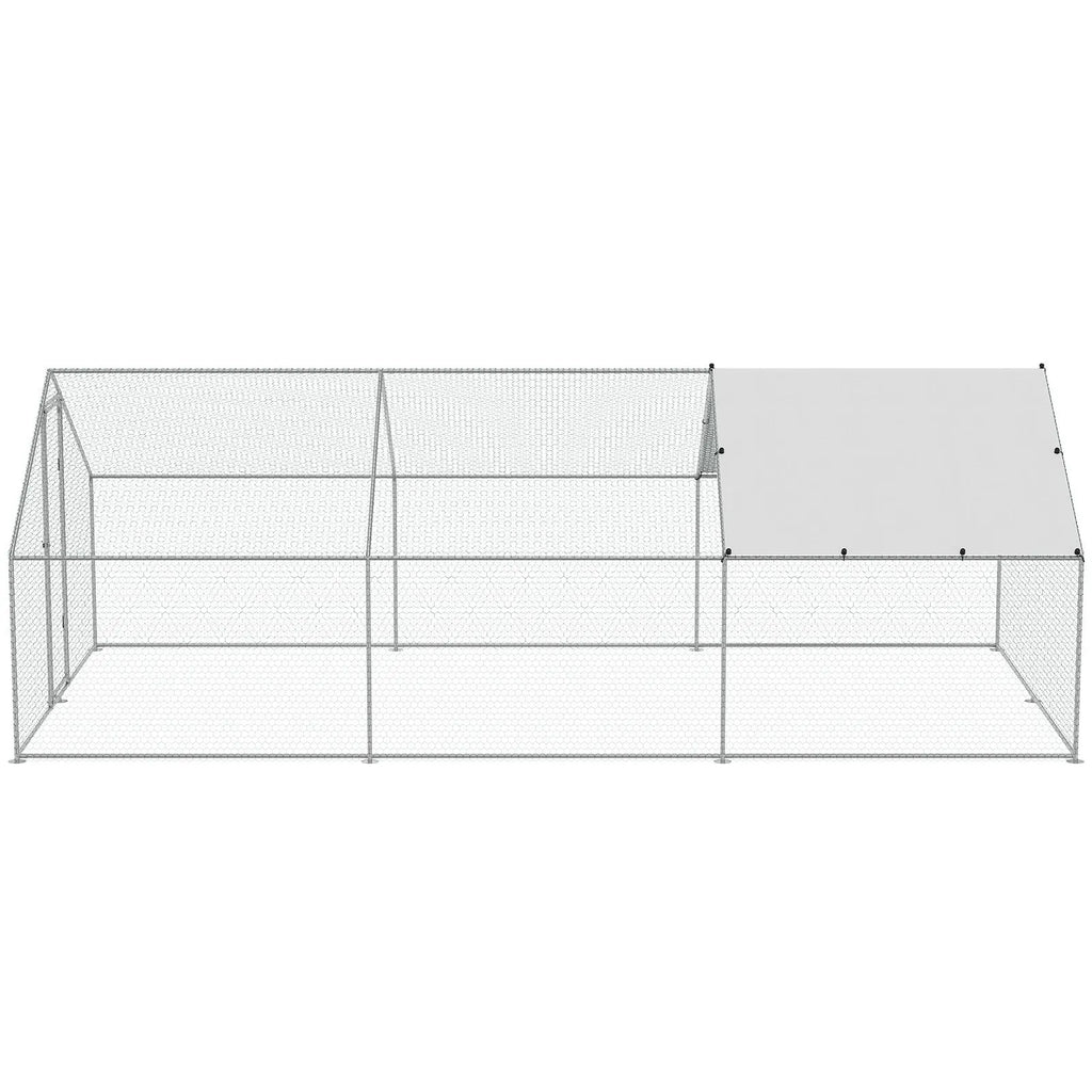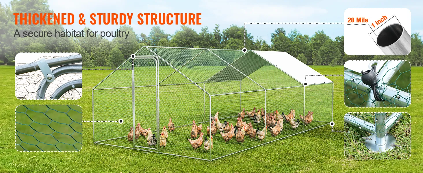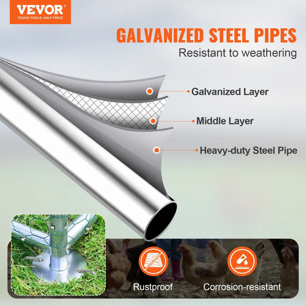 VEVOR lielā metāla vistas kūts izgatavota ilgstošai lietošanai. Cinkotā tērauda caurules un PE tīkls iztur dažādus laikapstākļus, savukārt izturīgā konstrukcija nodrošina ilgu kalpošanas laiku. Tā ir vērtīga investīcija ikvienam, kurš vēlas uzticamu un ilgnoturīgu risinājumu.