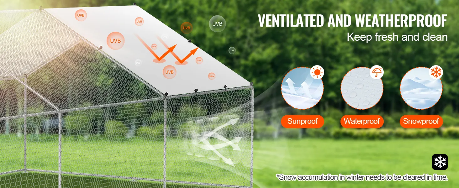 VEVOR lielā vistas pastaigu zona ir veidota ar ventilāciju no četrām pusēm, lai samazinātu baktēriju veidošanos un nepatīkamus aromātus. Ziemā noteikti notīriet uzkrājušos sniegu, lai saglabātu svaigu un veselīgu vidi jūsu mājputniem.