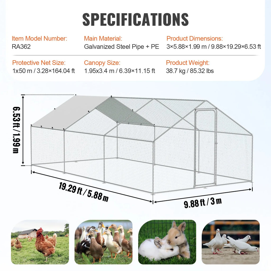 VEVOR lielā metāla vistas kūts ir lielisks risinājums vistu, pīļu un citu mājputnu drošai turēšanai. Izturīgais cinkoto tērauda cauruļu rāmis un PE aizsargtīkls nodrošina stabilu un drošu konstrukciju dažādos laikapstākļos. Plašie izmēri — 3,01 × 5,88 × 1,99 m — sniedz daudz vietas putnu kustībai un aktivitātēm, padarot kūti piemērotu gan pagalmam, gan saimniecībai.
