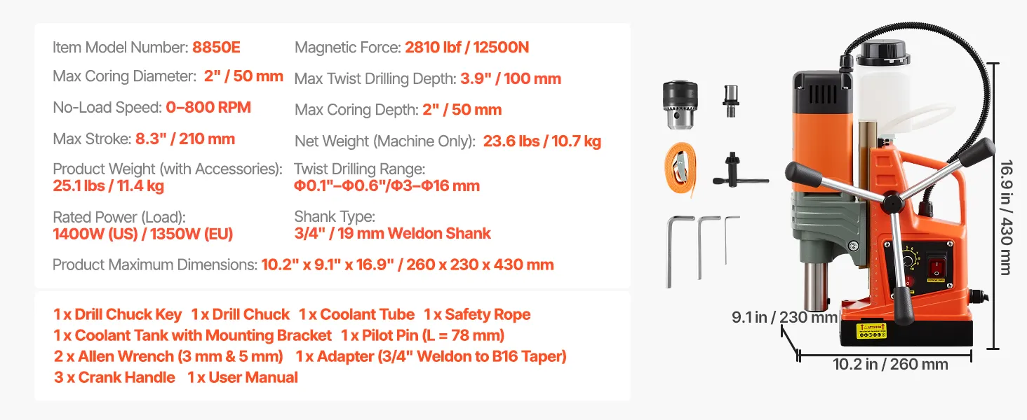 Modeļa numurs: 8850E Kāta tips: 19 mm Weldon kāts Nominālā jauda (slodzē): 1350 W (ES) Magnētiskais spēks: 12 500 N Bezslodzes ātrums: 0–800 apgr./min Maksimālais vainadziņa urbuma diametrs: 50 mm Maksimālais vainadziņa urbuma dziļums: 50 mm Spirāles urbšanas diapazons: 3–16 mm Maksimālais spirāles urbuma dziļums: 100 mm Maksimālais gājiens: 210 mm Neto svars (tikai ierīce): 10,7 kg Produkts svars (ar piederumiem): 11,4 kg Produkta izmēri (G × P × A): 260 × 230 × 430 mm