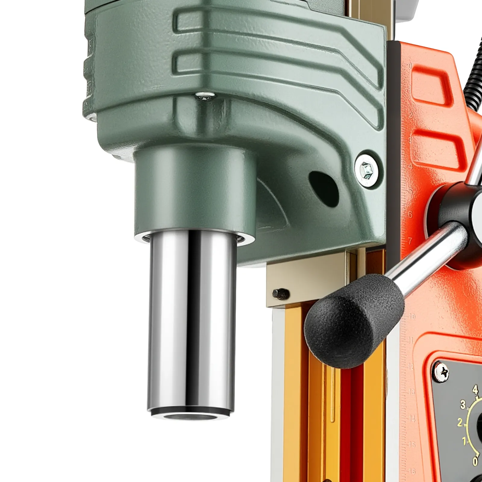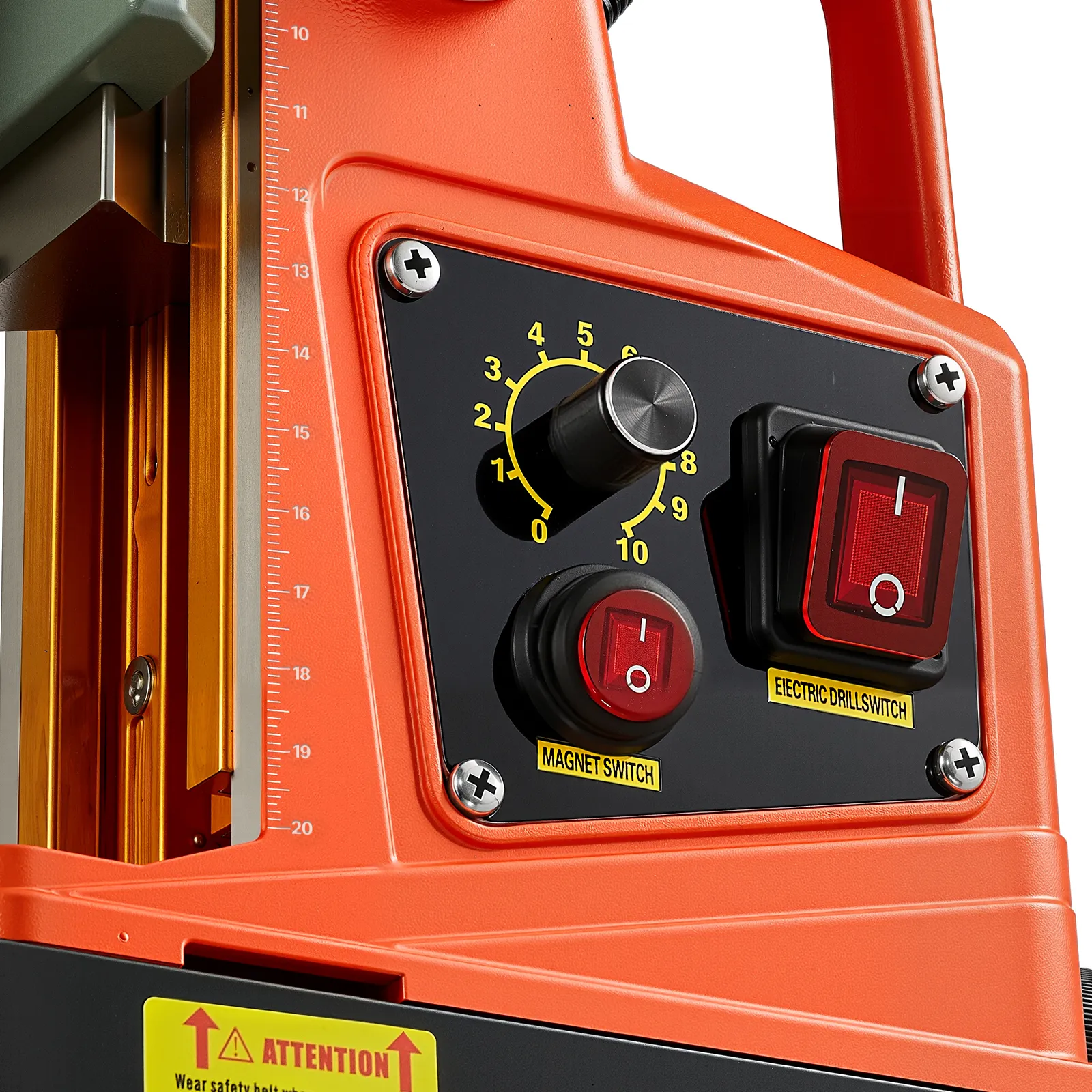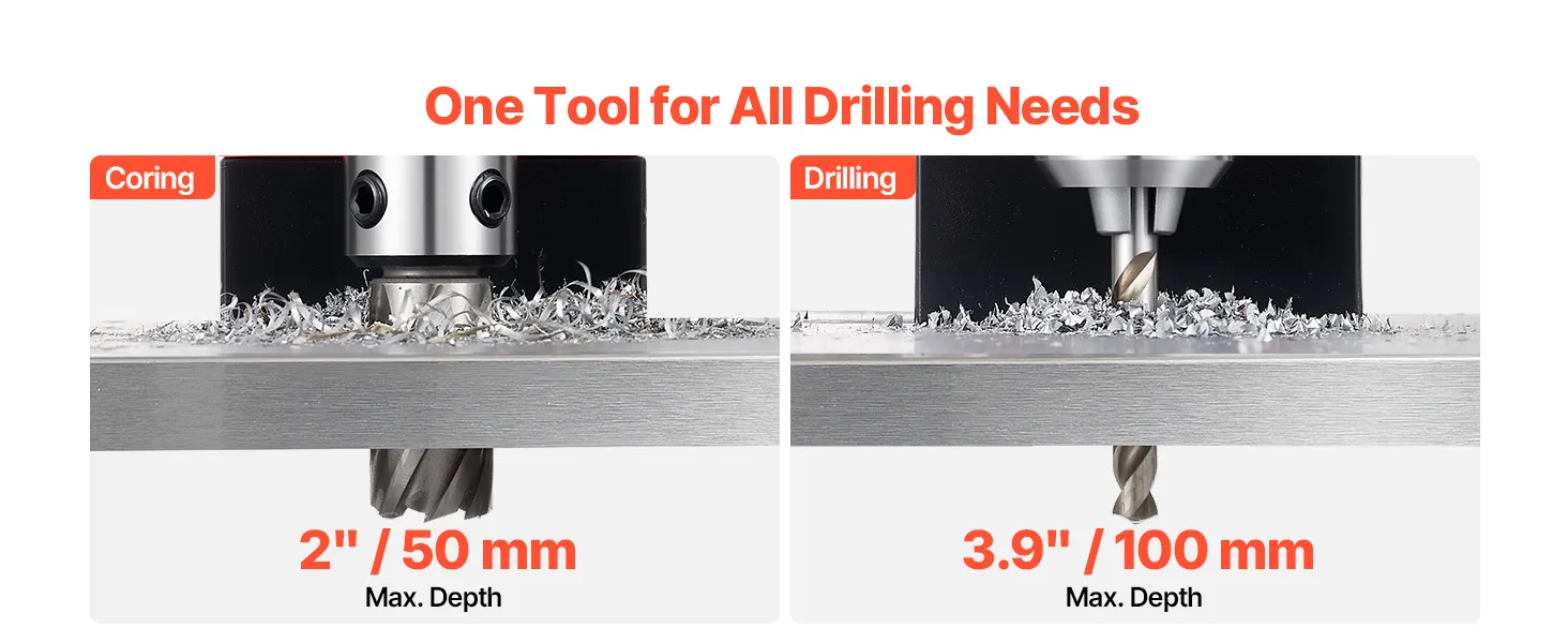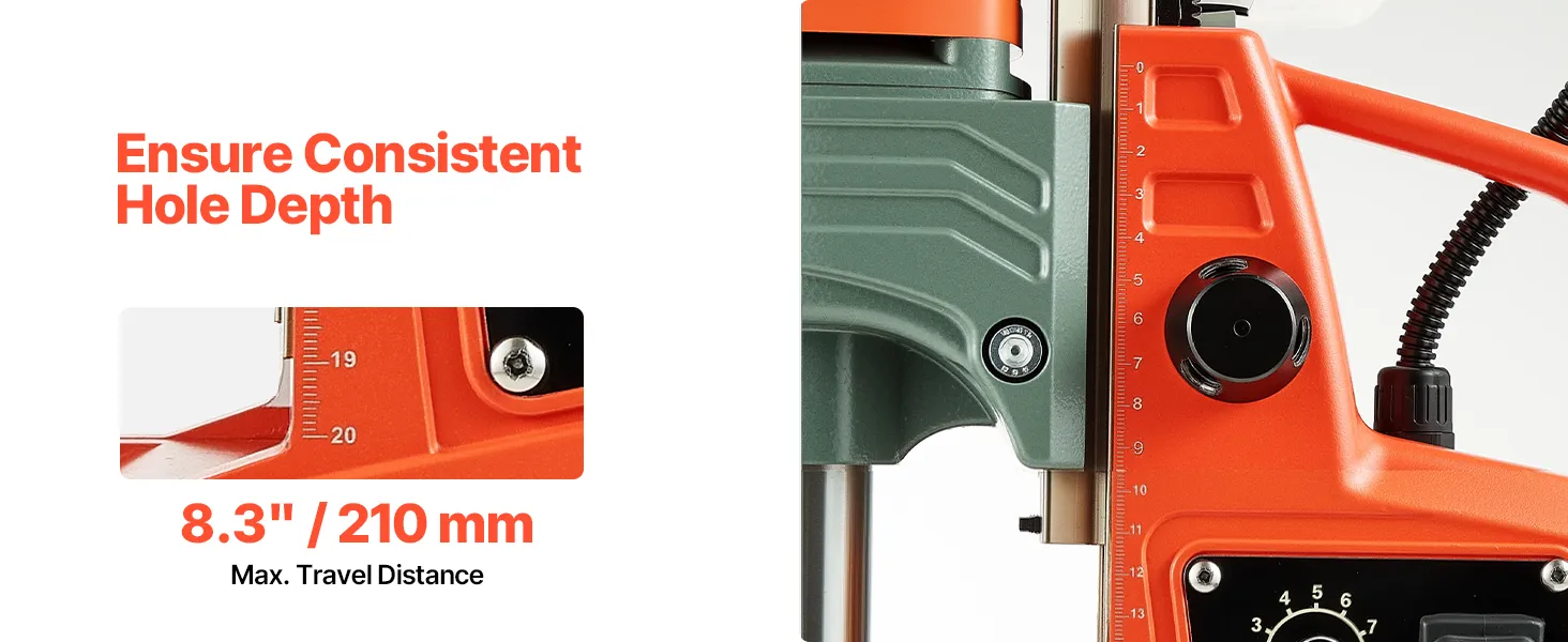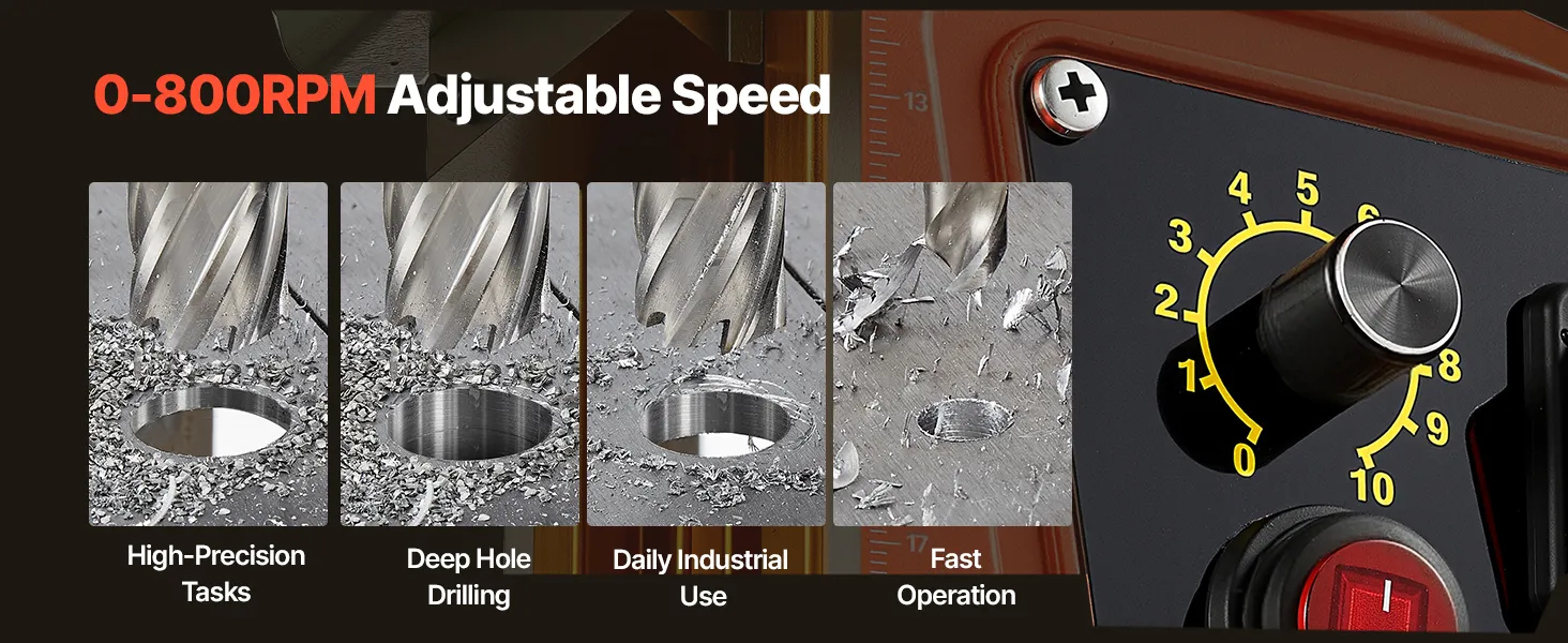 Precīza kontrole: Magnētiskajai urbjmašīnai ir 10 ātruma līmeņi (0–800 apgr./min), kas ļauj pielāgot ātrumu materiālam un konkrētajam uzdevumam. Zemāki ātrumi nodrošina precīzu darbu, bet augstāki — ātru urbumu veikšanu. Iebūvētās dziļuma mērlīnijas nodrošina konsekventus un precīzus rezultātus.