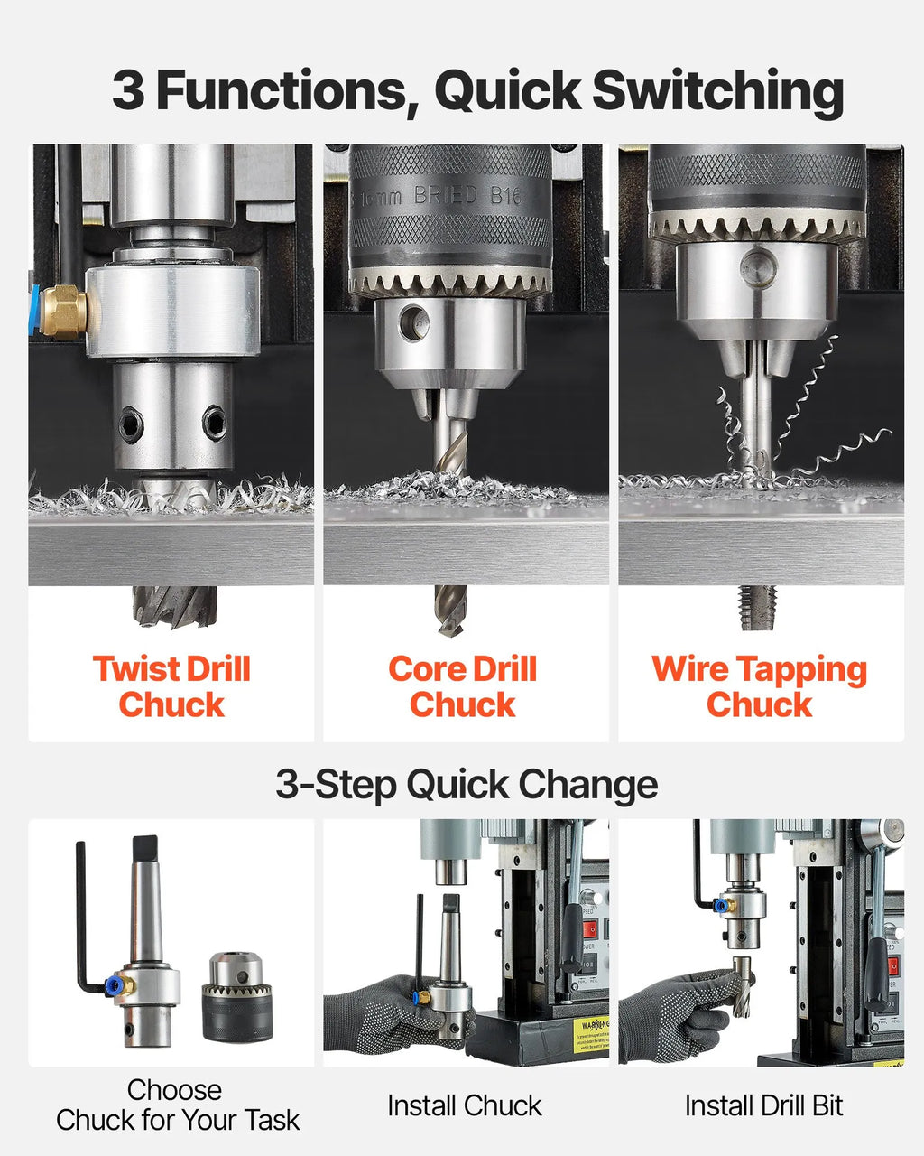 3-vienā jaudīga funkcija: Šī magnētiskā urbjmašīna atbalsta vainadziņu urbšanu, vītņošanu un spirāles urbšanu. Ar uzlabotu 60 mm vainadziņa diametru tā viegli tiek galā ar liela apjoma darbiem. Spirāles urbšanas diapazons: 3–16 mm, vītņošanas diapazons: M3–M16.