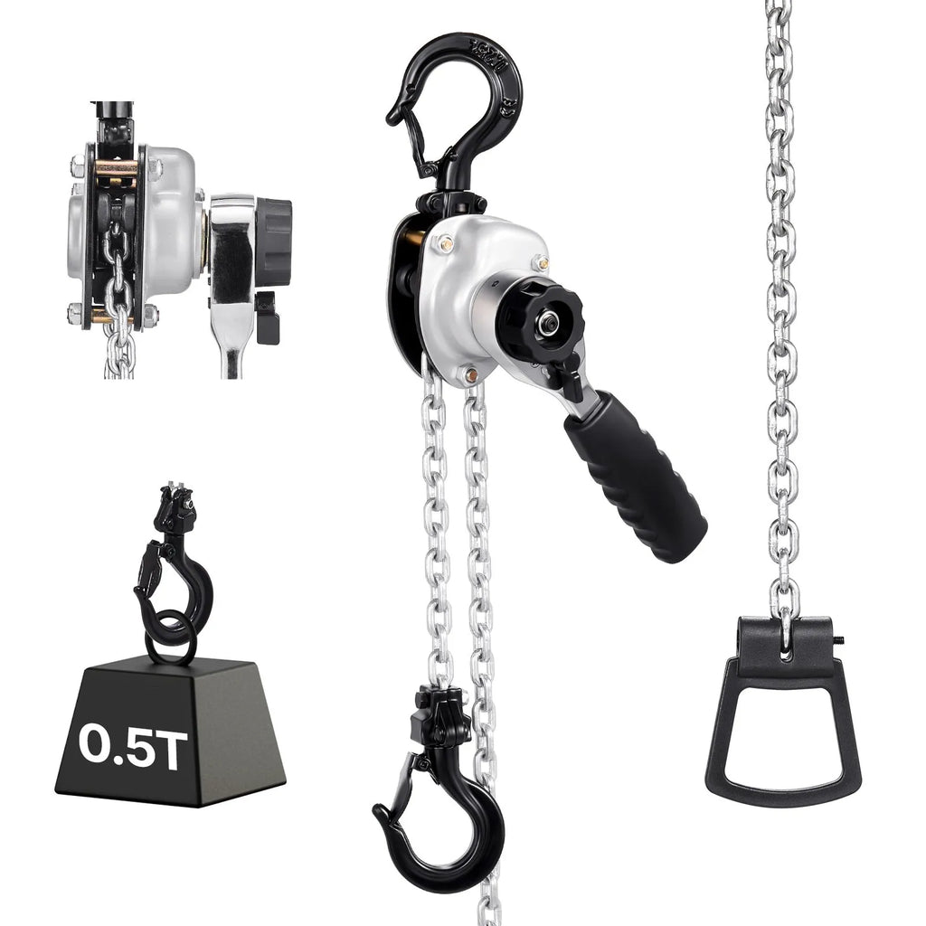 VEVOR manuālais sviras ķēdes pacēlājs, 0,5 t (500 kg) celtspēja, 1,5 m celšanas augstums, G80 sakausējuma tērauda ķēde ar dubultā suņa bremzi un 360° rotējošiem āķiem, piemērots noliktavām, būvniecībai un garāžām