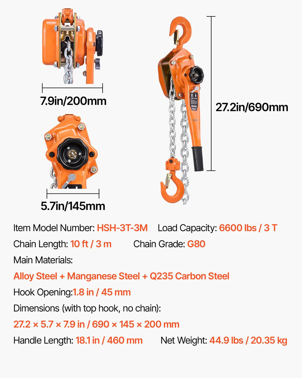 Produkta specifikācija Modeļa numurs: HSH-3T-3M Celtspēja: 3 t Ķēdes garums: 3 m Āķa atvere: 45 mm Ķēdes klase: G80 Izmēri: 690 × 145 × 200 mm Roktura garums: 460 mm Neto svars: 20,35 kg