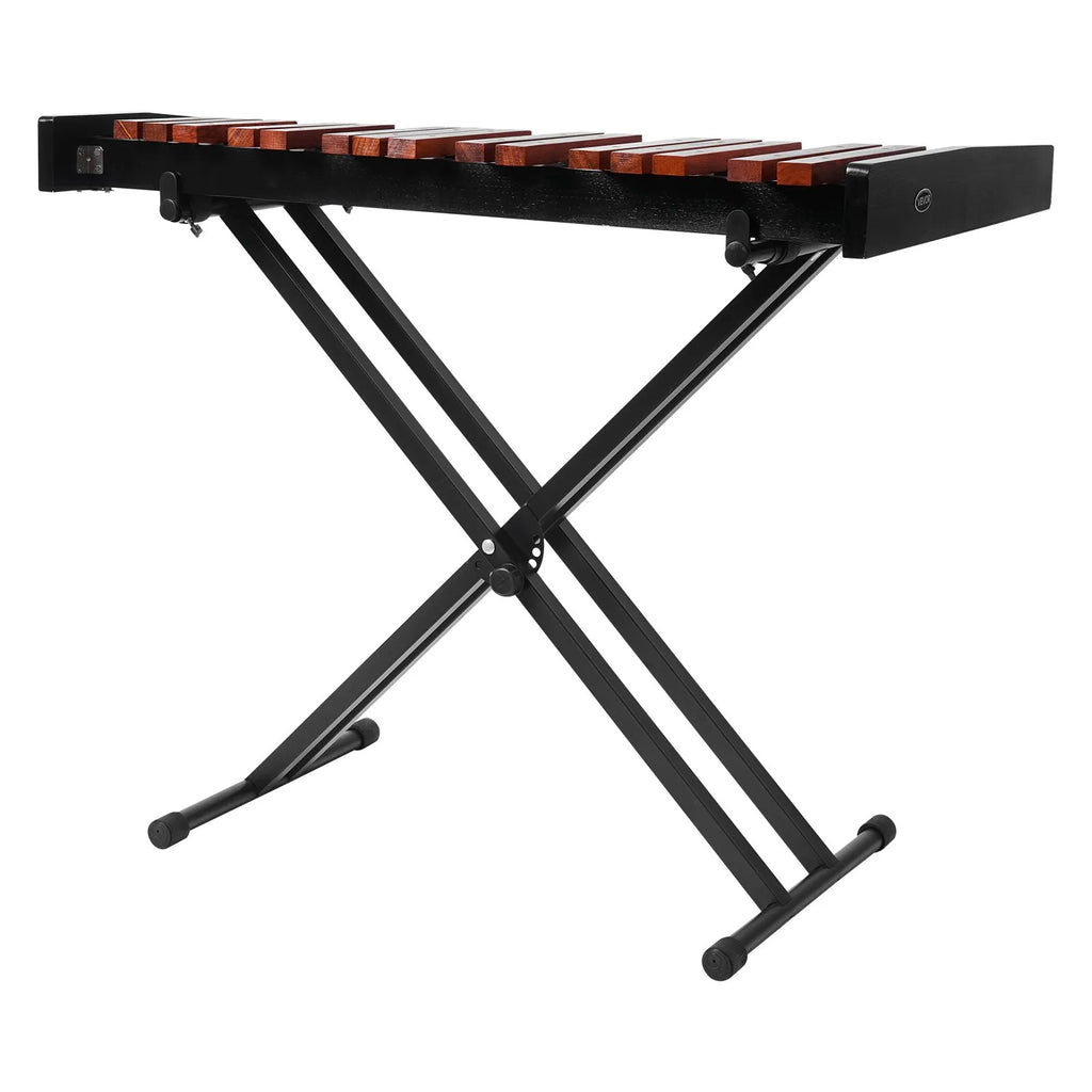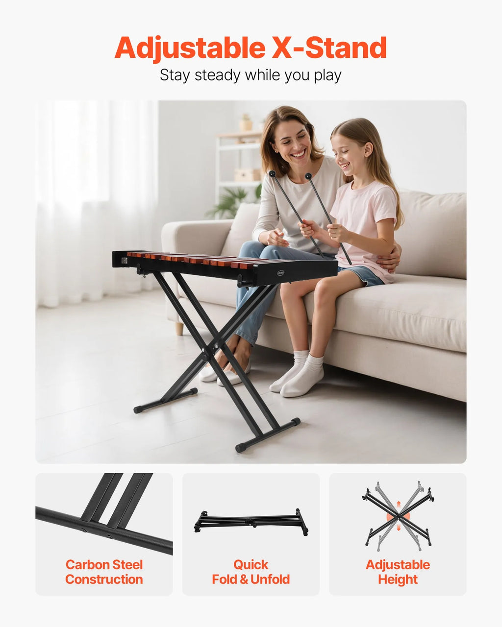 Salokāms X statīvs: Metalofonam ir pievienots karbona tērauda salokāmais X statīvs, kas nodrošina stabilu balstu spēles laikā. Regulējamais augstums 320–950 mm diapazonā piemērots jebkura vecuma lietotājiem, un salokāmais dizains atvieglo transportēšanu un uzglabāšanu.
