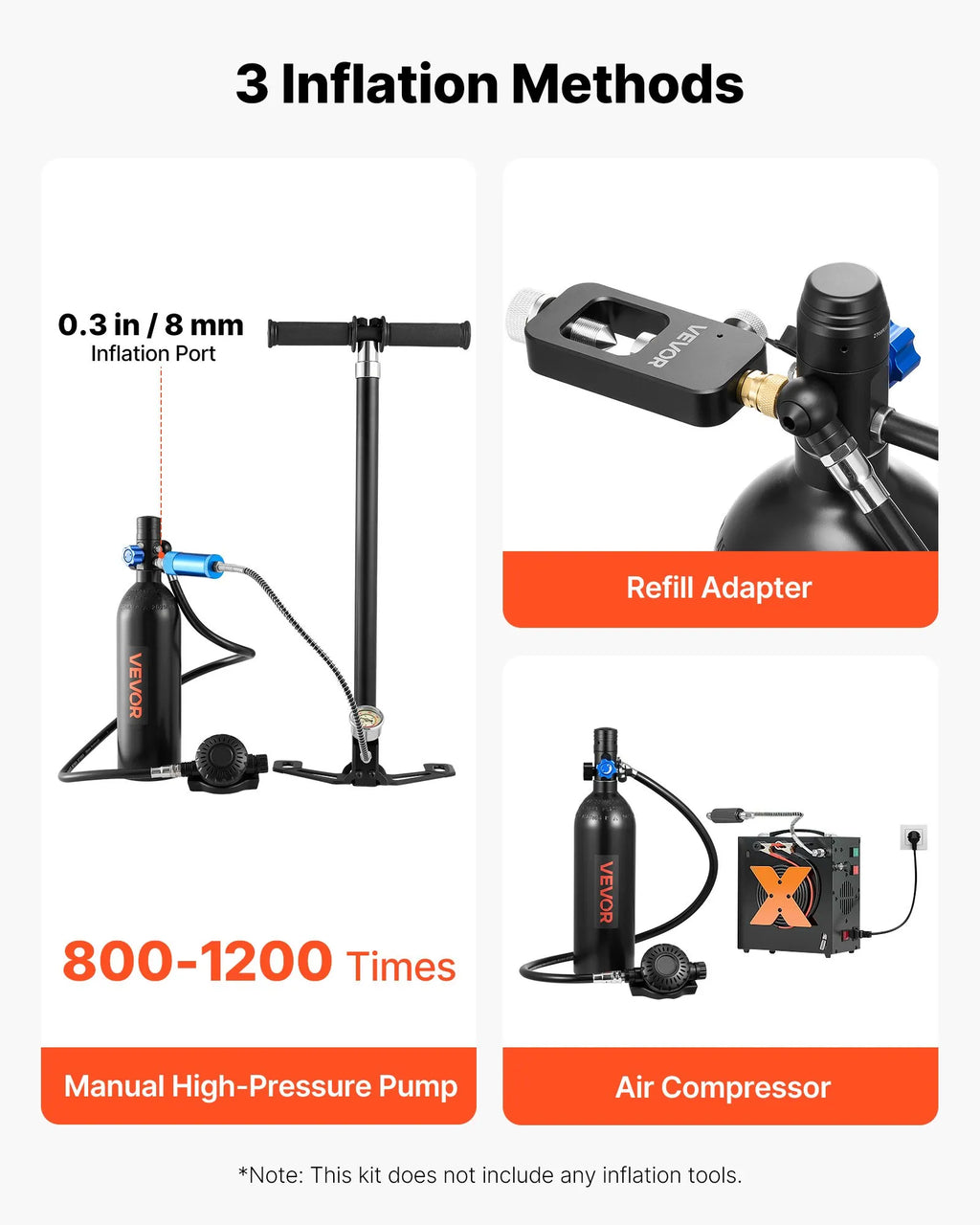 Mūsu niršanas balona komplekts atbalsta dažādas uzpildes iespējas: manuālo sūkni, niršanas balona adapteri vai saderīgu gaisa kompresoru. Piezīme: uzpildes rīki komplektā nav iekļauti. Pirms lietošanas pārliecinieties, ka jums ir atbilstošs uzpildes aprīkojums.