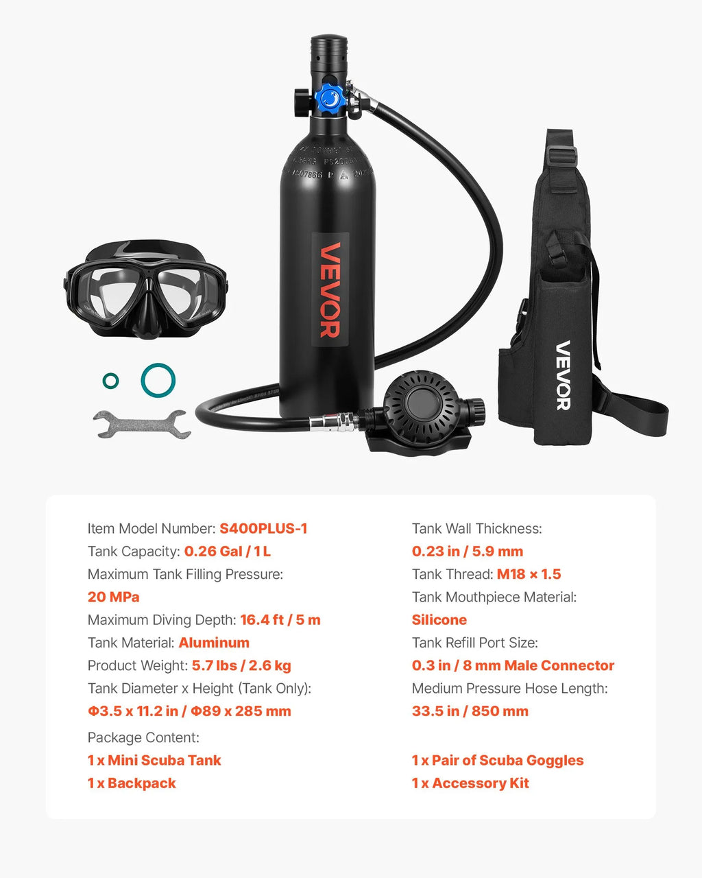 Pilns niršanas komplekts: 1 L mini niršanas balons kopā ar niršanas aizsargbrillēm nodrošina aptuveni 15–20 minūšu elpošanas laiku zem ūdens līdz 5 m dziļumam. Piemērots snorkelēšanai, seklā ūdens izpētei un avārijas lietošanai.
